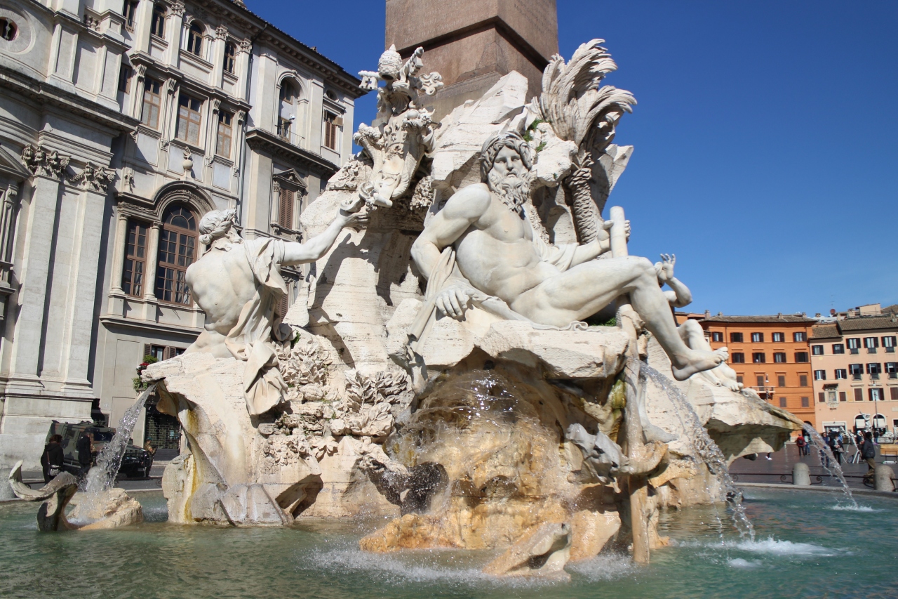 バロックの傑作と言われている「四大河の噴水」世界の4大河、ナイル川(アフリカ)、ガンジス川(アジア)、ドナウ川(ヨーロッパ)、ラプラタ川(南アメリカ)を擬人化した4体の男性の彫像と中央にオベリスク 噴水のまわりを何周も歩き 満喫しました