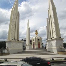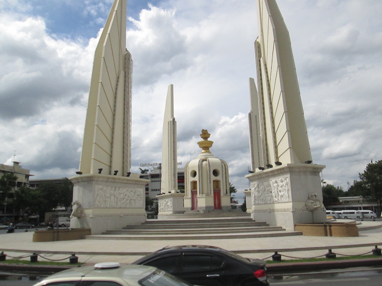 カオサン通りに行くときの目印にもなる民主記念塔 (アヌサーワリー プラチャーティパタイ)です。これを見たら、バスを降りる準備をします。塔自体は、タイの民主主義を記念して建てられたものだそうです。大きなロータリーの真ん中にあります。