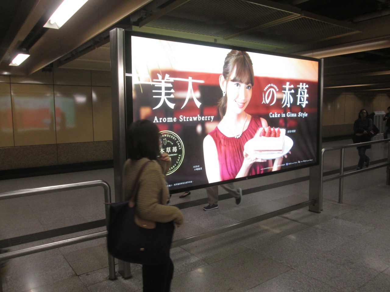 香港の地下鉄を歩いていると、日本の商品を宣伝する広告看板を見かけます。日本では見かけない香港限定の中国語中心です。日本と異なるのは、通路の壁よりも、スペースを上手に使い看板を設置しているところです。また、突然に出現するのでインパクトがあります。