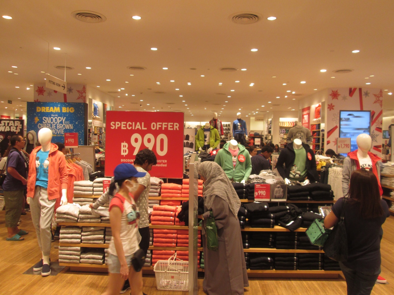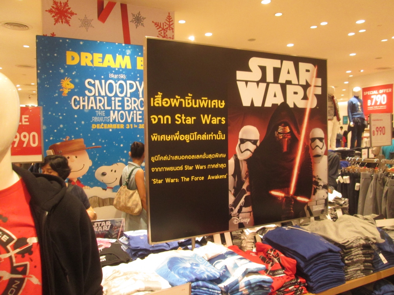 最新作「スター・ウォーズ」の公開を記念してユニクロのオリジナルプリントウェアが販売されていました。バンコクでもスター・ウォーズが人気のようで、店内で期間限定の商品をディスカウント価格で扱っていました。