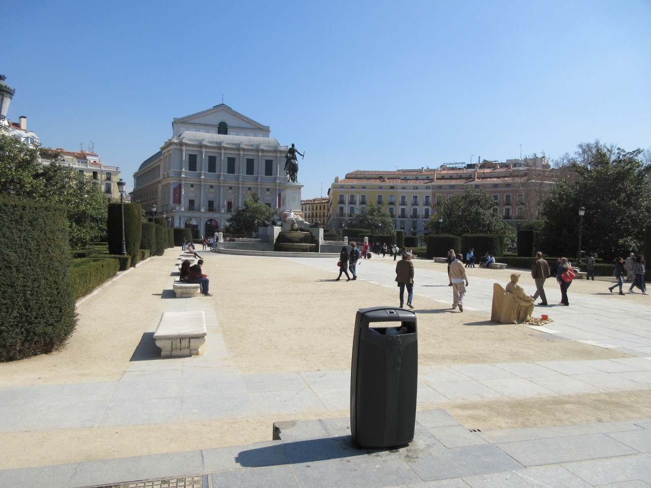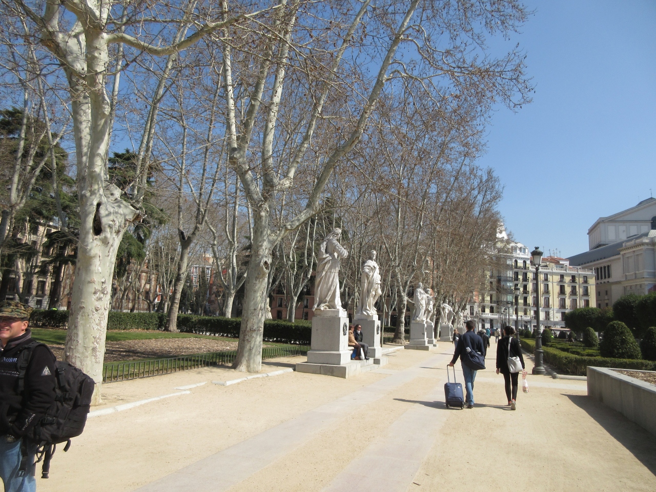 マドリード中心部にある、王宮と道を挟んで王立劇場までの間にある広場がオリエンテ広場です。 真ん中に騎馬像があり、広場を取り巻くように置かれた白い石像群が印象的です。天気が良かったので、青空に白い像がよく映えて美しかったです。