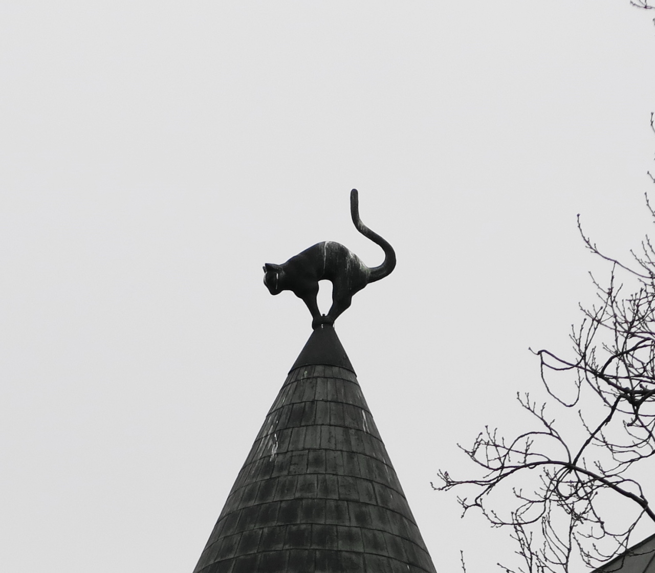 円錐型の屋根の上に今にも飛び降りそうな猫の像があります!