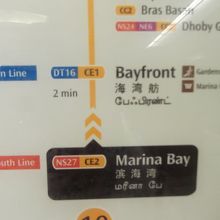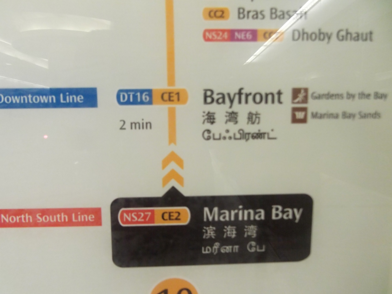 黄色の線と、青いダウンタウンラインがあります。シティーホールからはノースサウスラインの赤でマリーナベイ駅で黄色に乗り換えて、行きました。ダウンタウンラインの起点になる駅だと思います。