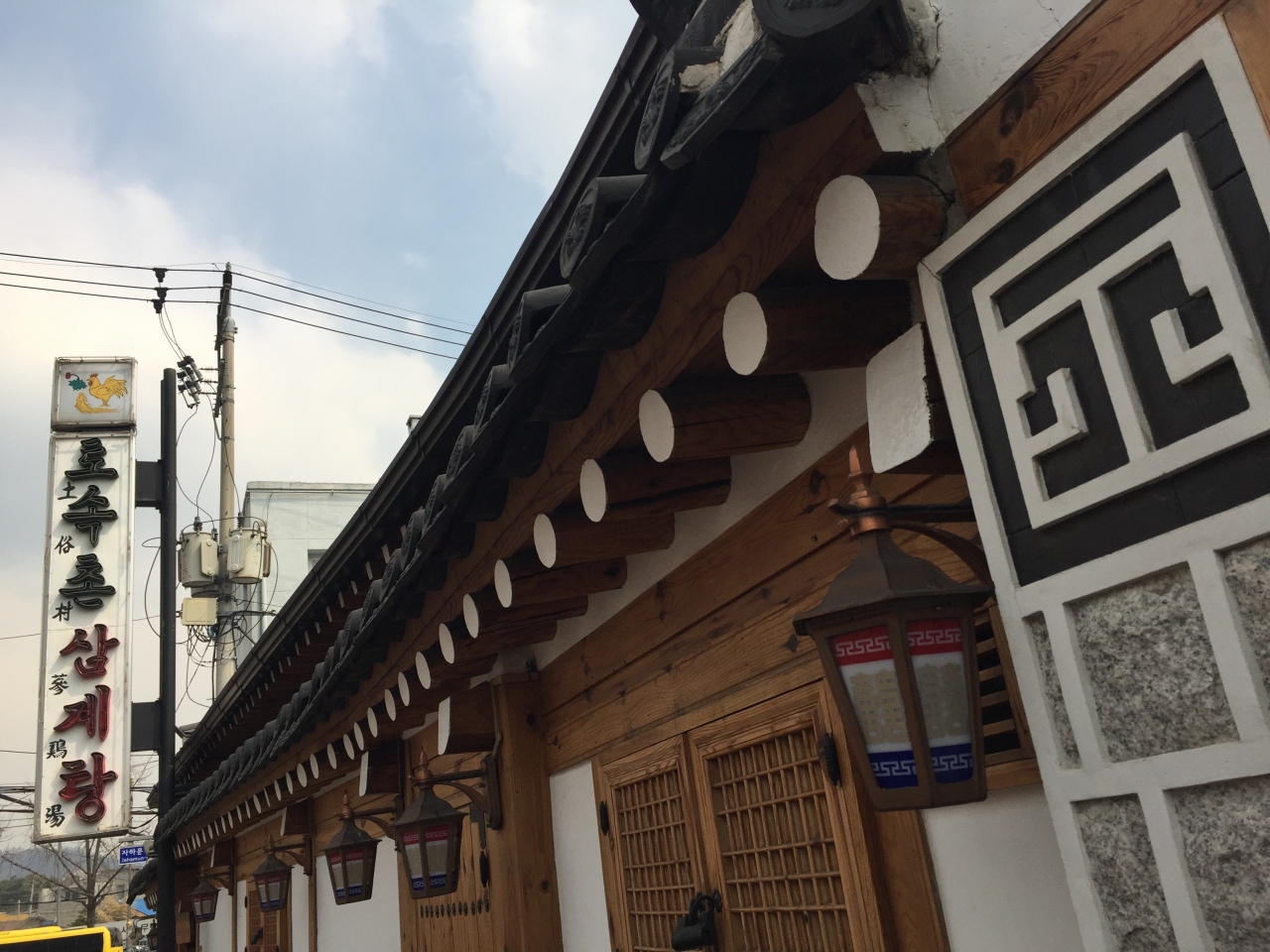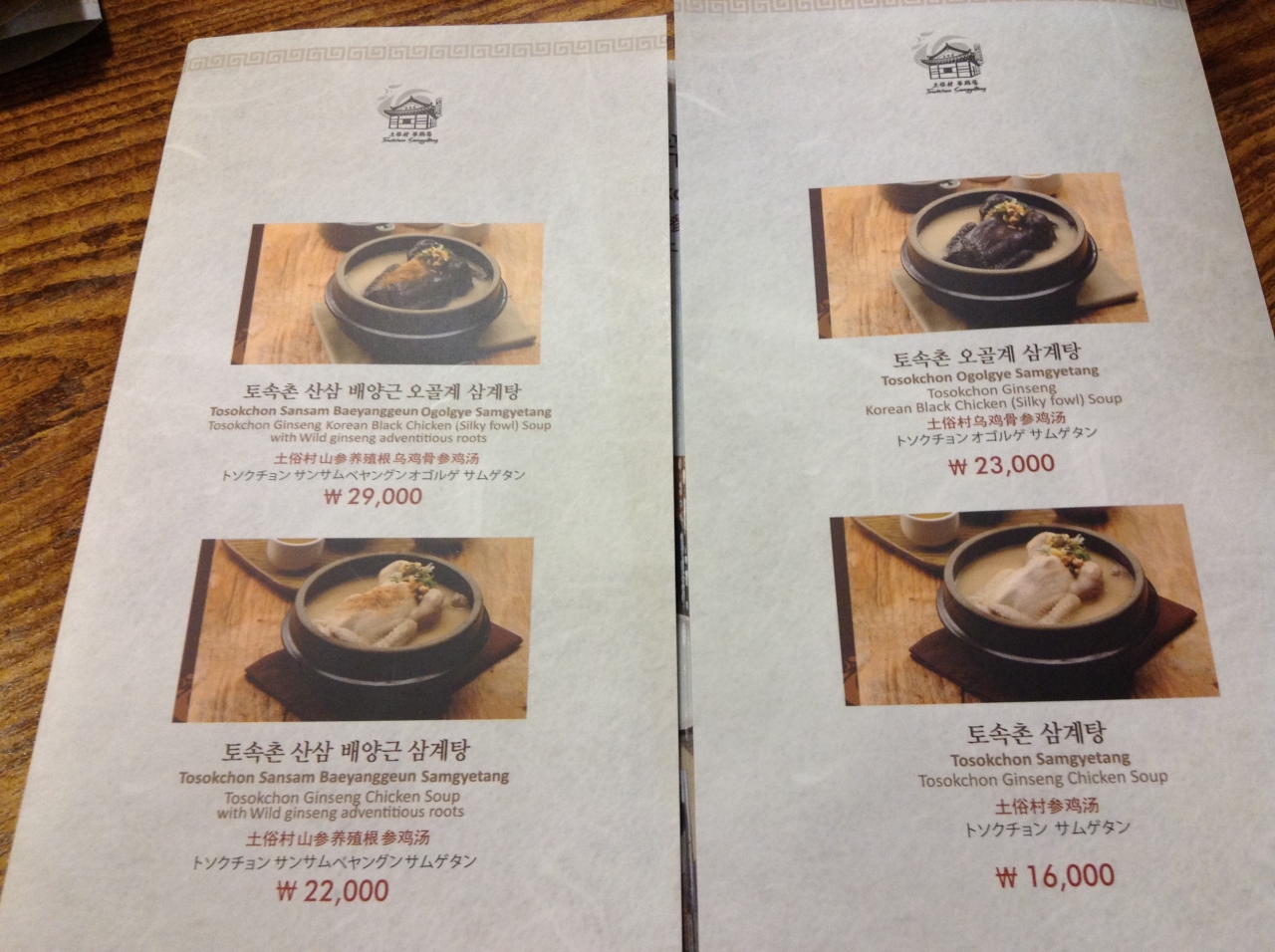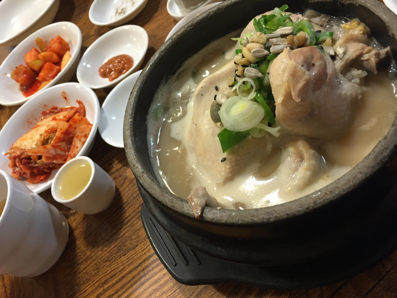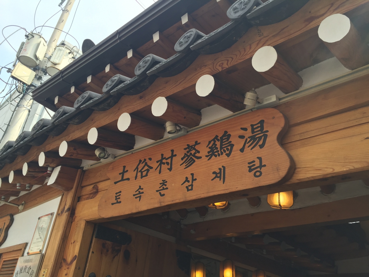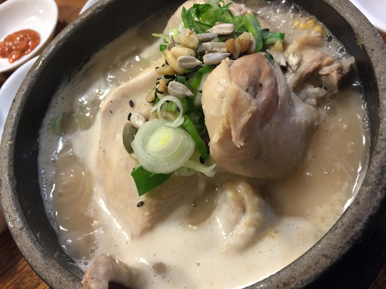 13時半ぐらいに来店しました。ランチ時間ということもあり店の建物に沿って長い行列ができていました。行列を見てびっくり!行列を見てあきらめてしまう方もいるかと思いますが意外と回転が速くて待ち時間は行列の長さにしては短いと思います。店の中に入ってみるとかなり広い!席数を調べていなかったのですが、あとで調べてみると約400席もあるそうです。メニューは日本語表記もあり食べ方の説明も書いていました。参鶏湯はぐつぐつ熱々の状態で運ばれてきて、写真を撮ったら最初は湯気でかすんでしまいました。丸ごとの鶏肉がドンと入っていてお肉はやわらか、長い高麗人参や、なつめ、栗などが入っていて栄養がいっぱいつまっている感じ。白く濁ったスープは最後まで熱々で体が温まりました。鶏はお皿に移して塩やキムチなどで味を調整して食べます。お塩をつけて鶏を食べるとさらにおいしくてついつい塩をつけすぎてしまいましたので、スープは最初薄く感じましたがスープには塩をいれずそのままでちょうどよかったです。外観、内装とも韓屋の雰囲気で韓国旅行に来ていることが実感できるお店でした!