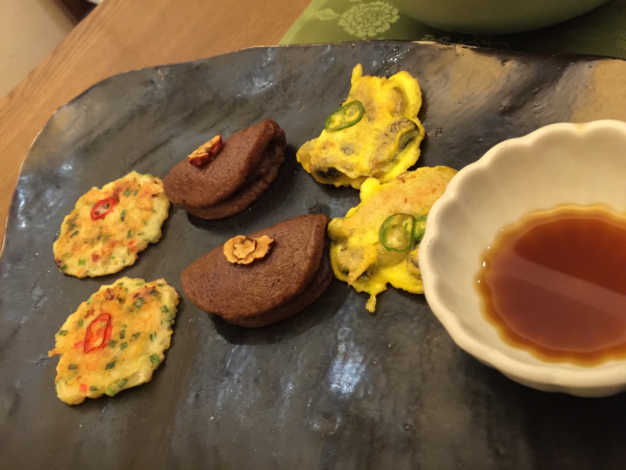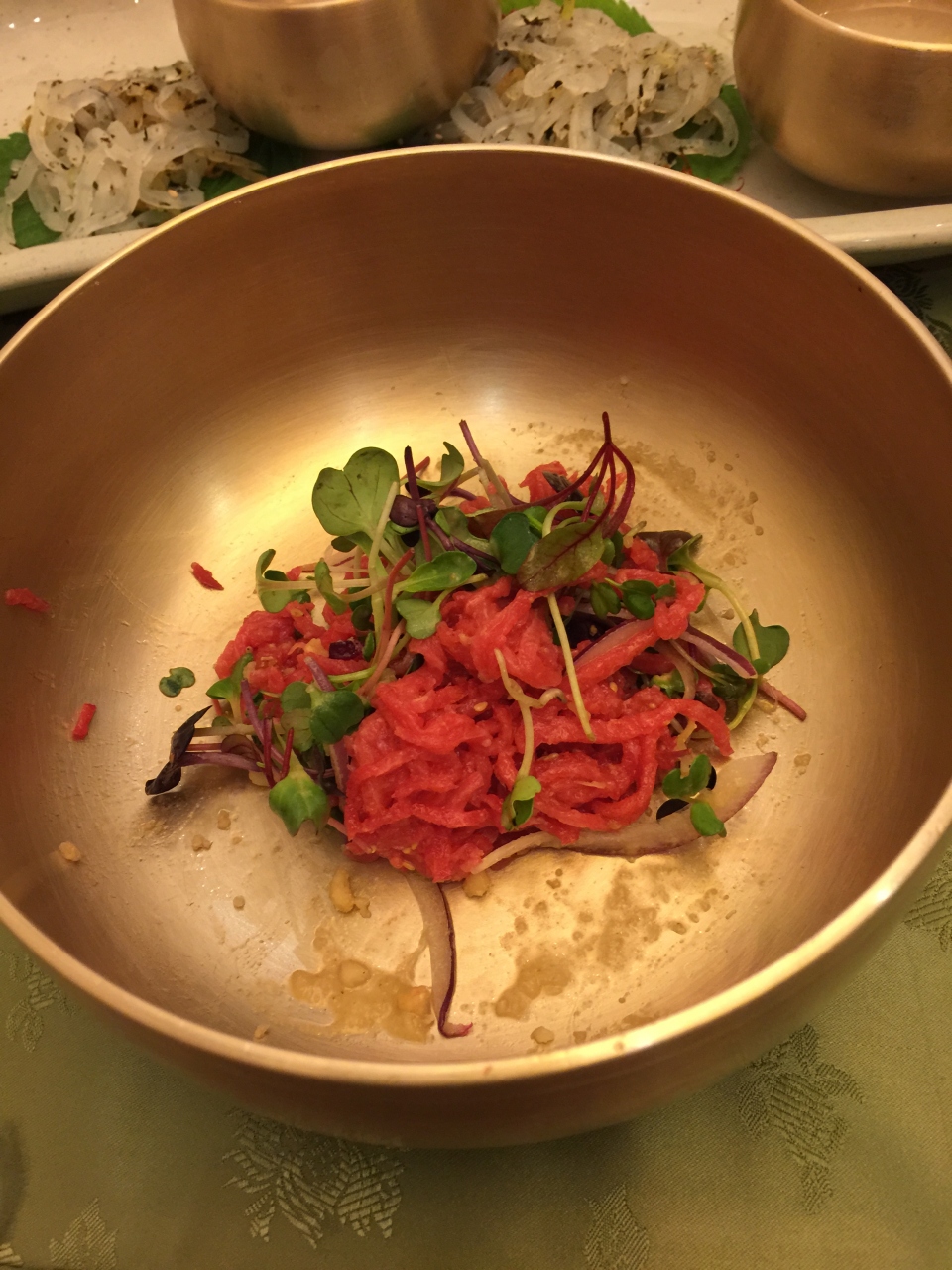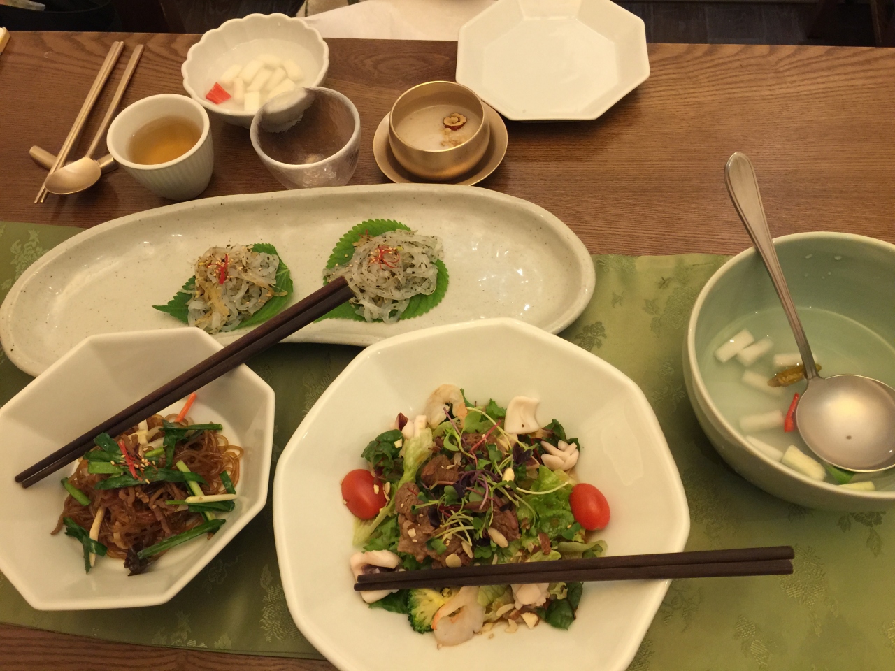 初めて韓定食を頂きました。キレイに少しずつ出てきて、目でも楽しめます。サラダ、スープ、ユッケ、ミニチジミ。。。などなど10品ぐらい出てきました。お部屋は個室でゆっくりできました。ビルの中にあって、高級な雰囲気でした。
