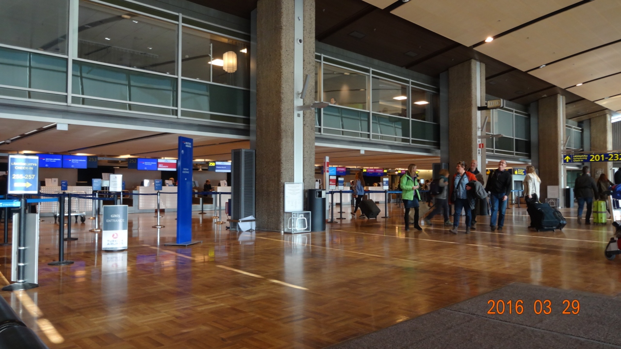 帰国日にこの空港に行ったのですが、搭乗する便が欠航になっていたため、添乗員さんが代替え便を航空会社と交渉する間、この空港内でスーツケースを抱えたまま待機していました。