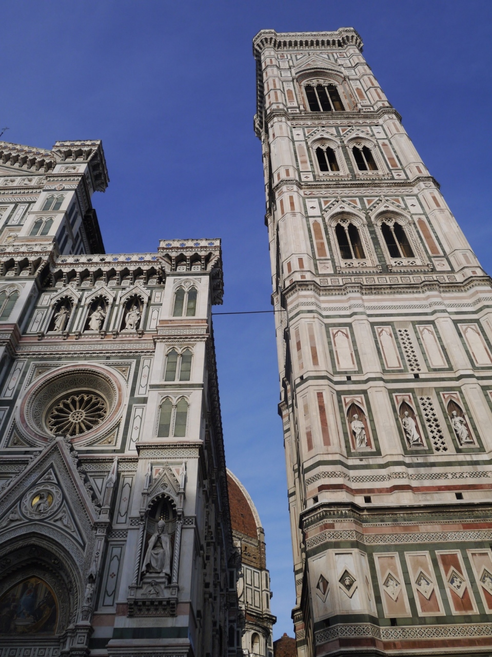 フィレンツェのドゥオモはその繊細な作りに何度見ても見とれてしまいます。薄いピンクのタイルなども細かく使われていて美しいです。観光客が大勢いすぎてザワザワしているのだけが難点ですが、こればかりは仕方ないですね。
