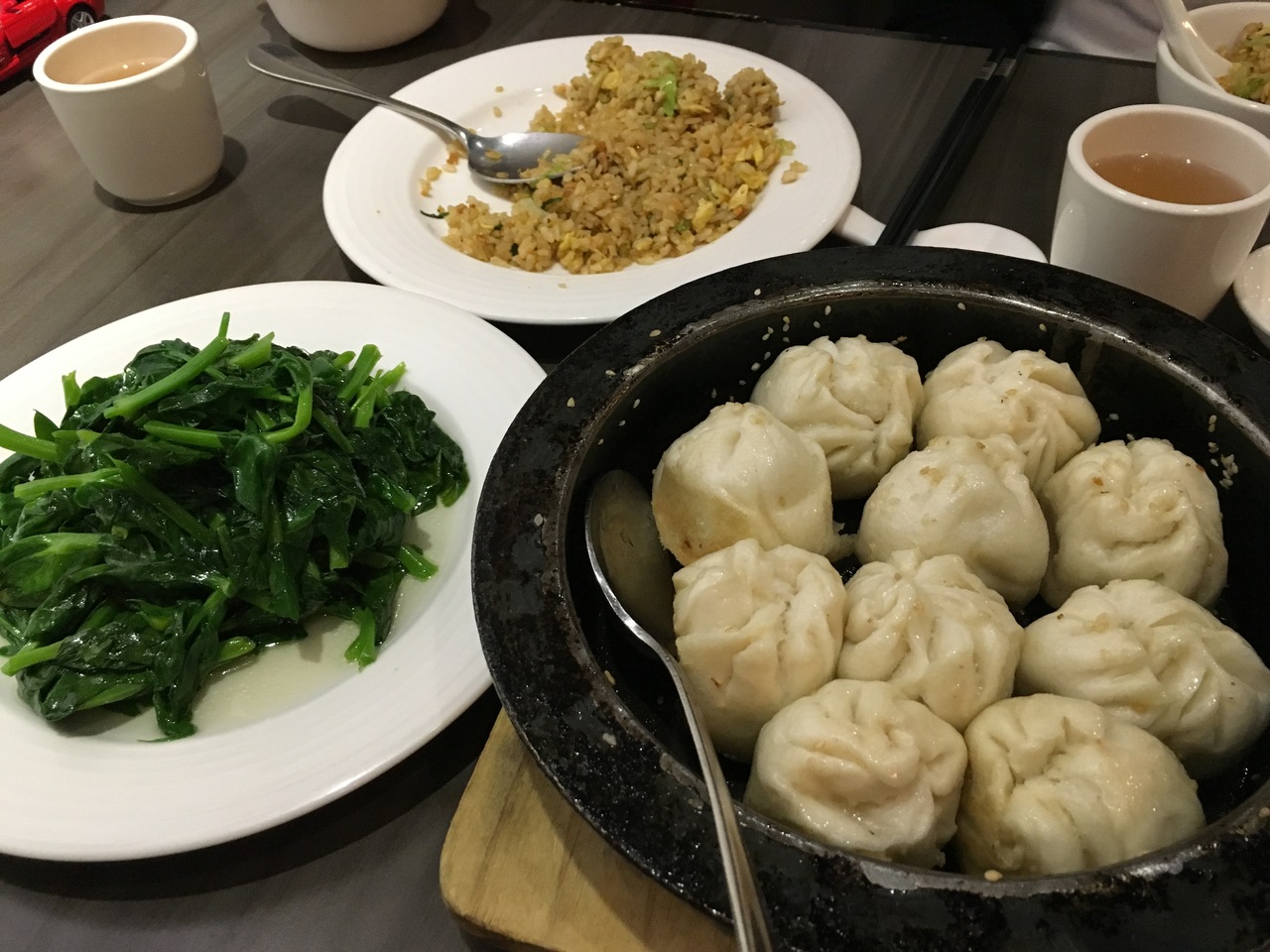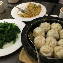 上海鐵鍋生煎包、炒飯、青菜、蝦雲呑米粉湯、などなど。