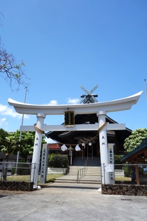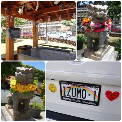 手水舎に手拭きペーパーが付いていたり、狛犬にはレイが掛けられいたり。