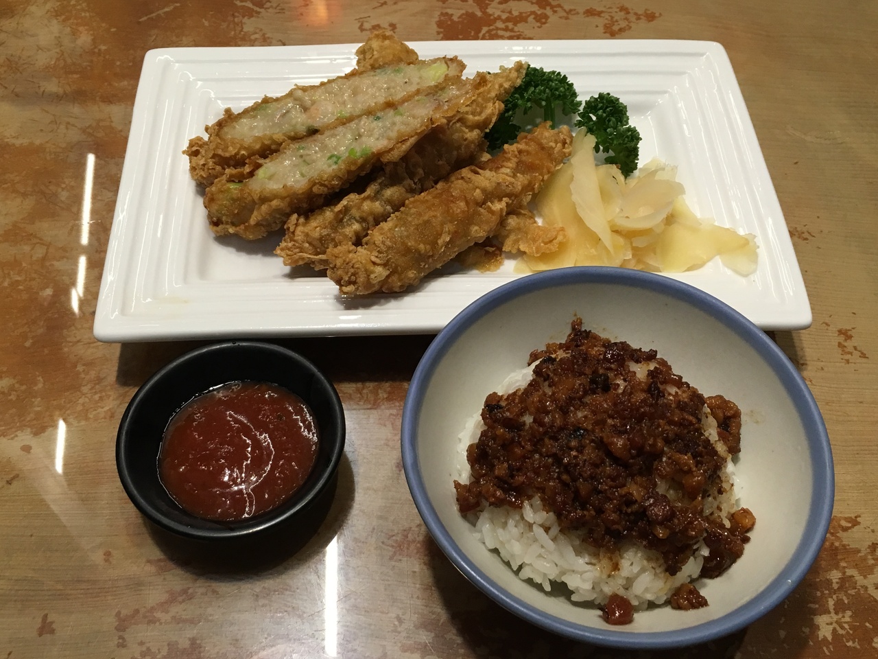夕方軽めに、魯肉飯と黄金蝦巻を注文。