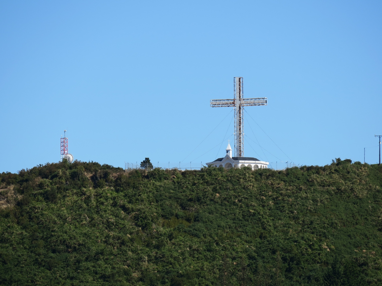プエルトモンのバスターミナルから出て、湖の方を見ると、大きな十字架が目に入ります。ここが、テングロ島で、丘の上に、白い教会と、大きな十字架のある島です。アンヘルモからボートで行くことができるそうです。