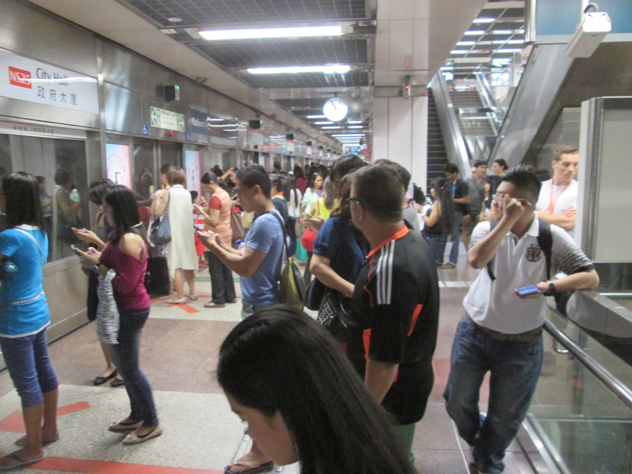 乗降客が多い駅です。ショッピングセンターや観光スポットが多いエリアなので、シンガポール市民だけでなく、観光客を多く見かけます。券売機には行列ができており、駅ホームにはMRTを待つ乗客がたくさんいました。