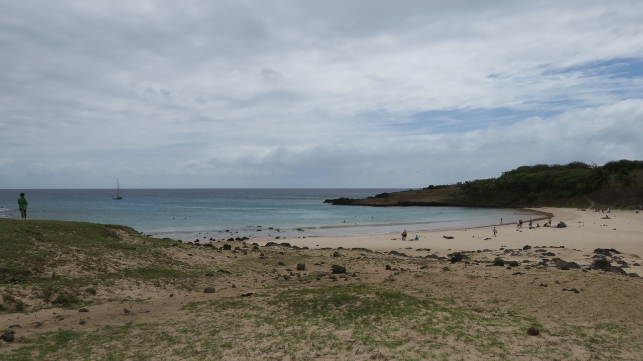 イースター島で唯一、遊泳のできるビーチとあって、地元の家族連れなども、おおく、遊びに来ていました。砂浜の後、少し小高い丘の上には、大変、趣のあるモアイ像が建っています。ここでは、食事をすることもできます。