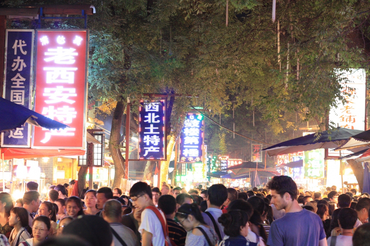 西安に6万人が暮らしているイスラム教徒“回族(中国語ではムスリムのことを回族という)”が多く暮らしている土地で、今では小吃街としても有名だ。特に夜は大晦日のアメ横のような賑わい。露店には羊肉の串焼き、イスラム系スイーツ、生絞りジュースといった食べ歩きのできる品々が並び、食欲がそそります。