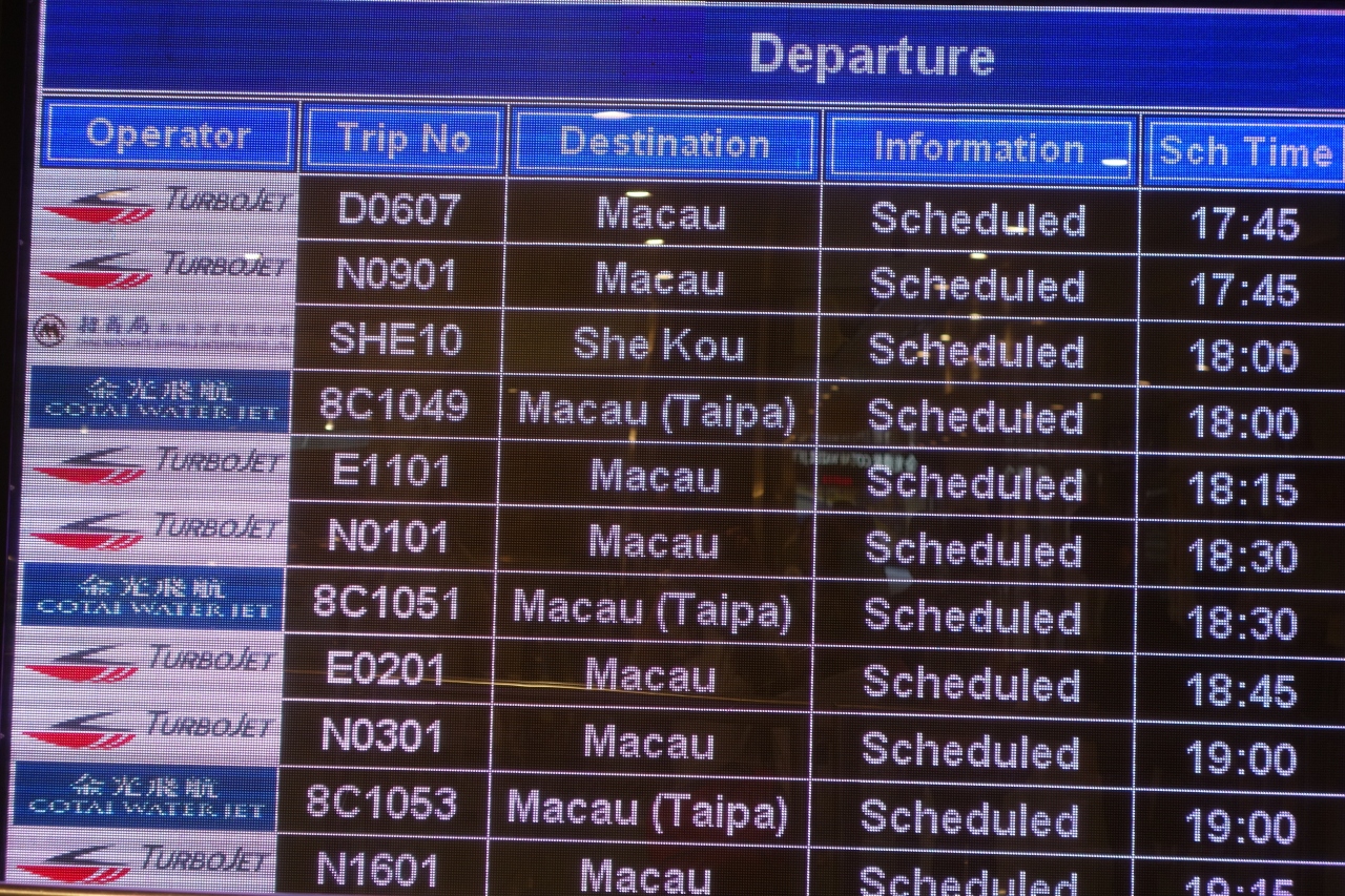 マカオ行のフェリーは、15分に1本の間隔で、24時間運航しているので、便利です。