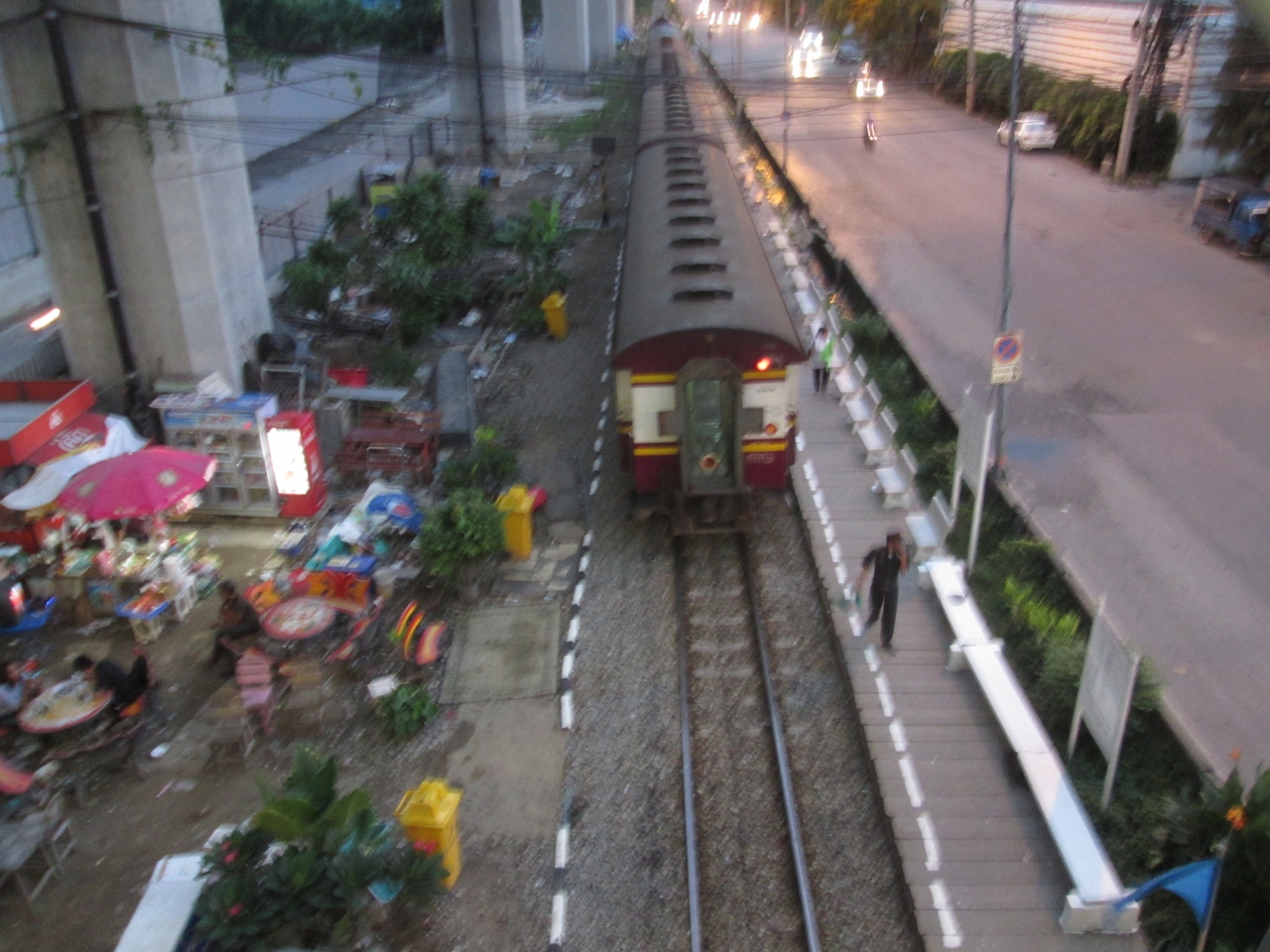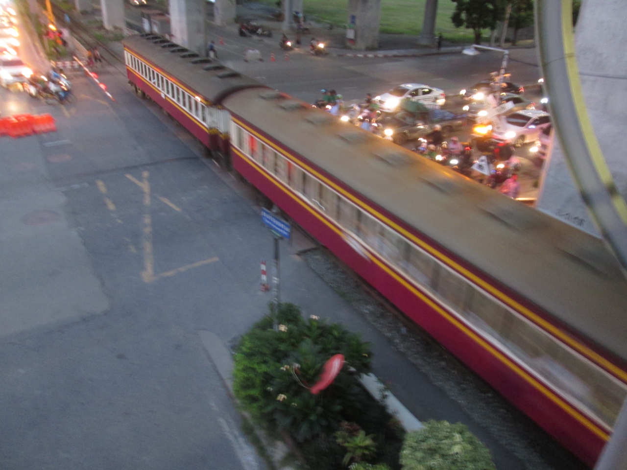 タイ国鉄のマッカサン停車場に列車が到着しました。BTS、MRTと比較すると走行速度は遅いです。踏切の遮断機が降り、渋滞の激しいアソック通りが一時的に封鎖されます。連結車輌の長い通勤用電車でしたが、乗降客は少ないようでした。