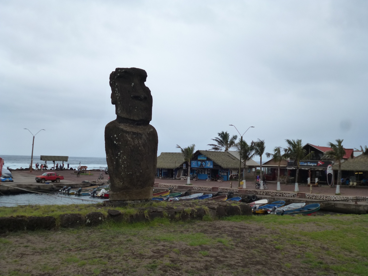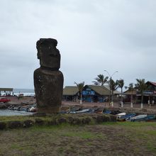 島の中心部に近い、村の海岸沿いに立っています。小さな漁船も多く停泊していますが、海の方を見ると、多くのサーファーが波乗りを楽しんでいます。この、モアイ像は、漁港のシンボル的な感じですが、サーファーたちを見守っているように見えます。