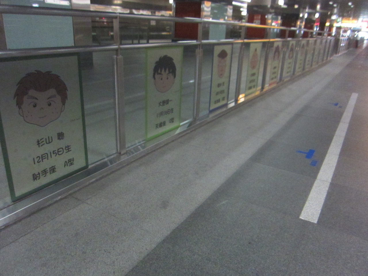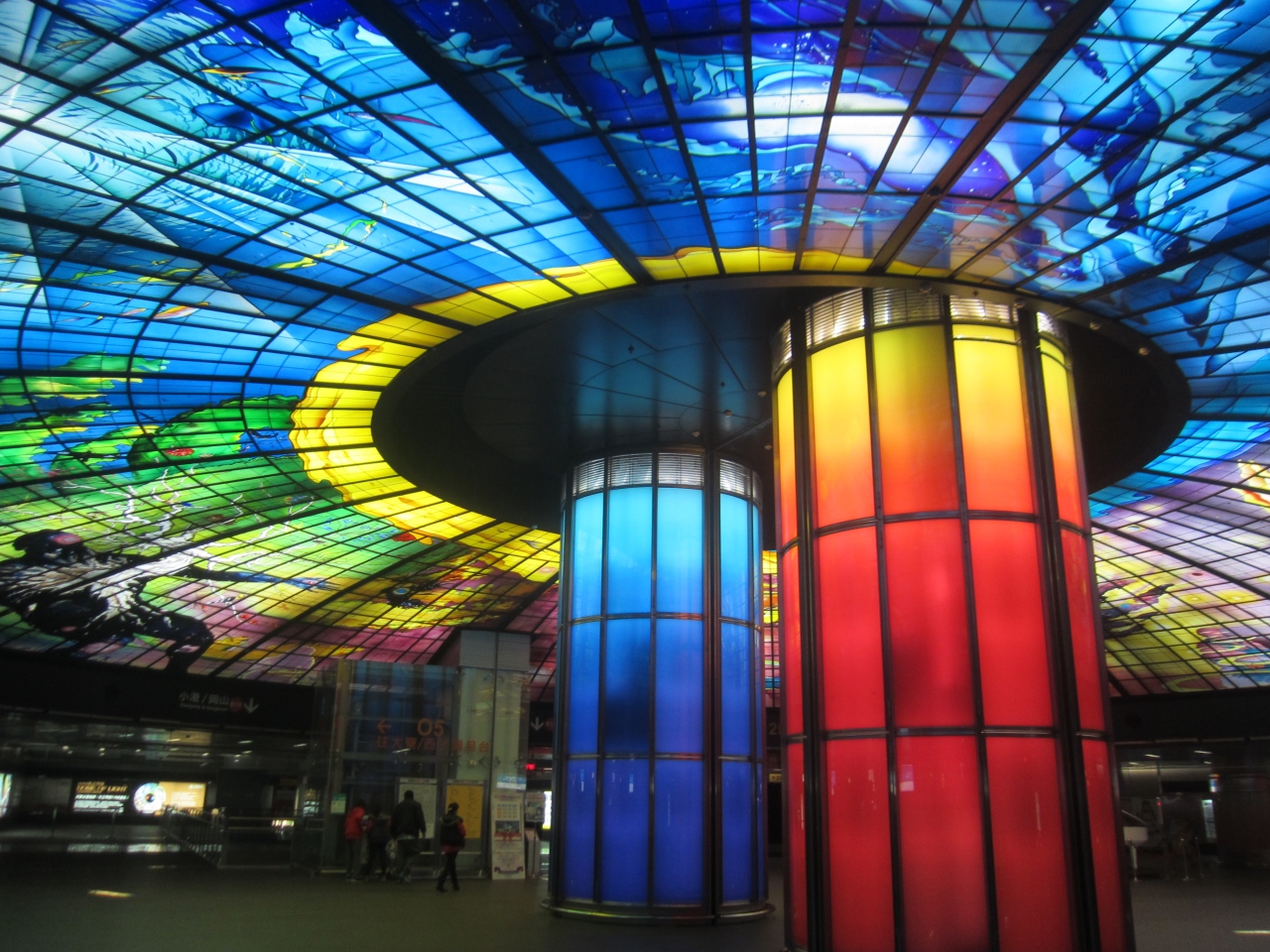 MRT紅線で高雄の隣で紅線と橙線の乗替駅でもあり高雄の街の中心地にあり、交通の要所になっています。11番出口を出るとすぐに六合夜市があります。また、駅構内(改札外)には4,500枚ものステンドグラスを使った光之穹頂でも有名な駅です。そして、何故かちびまる子ちゃんの登場キャラクターの紹介パネルも並んでいました。日本のアニメは海外でも健在という感じです。いろいろと見所の多い駅です。
