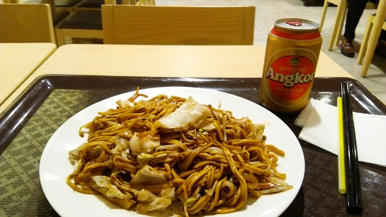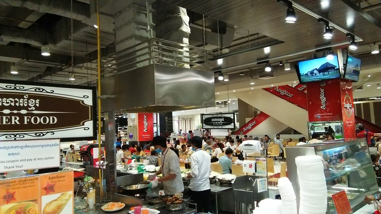 約2年前にオープンし今でも現地で大人気だというイオンモールのカンボジア1号店。今回4月のクメール正月明けの土曜日のお昼前後に訪問しました。全体的な印象としては日本の平均的なイオンモールのダサさとアジアっぽさが混在している感じでした。最初はあまり混雑してませんでしたが、徐々に来店者が増えてきました。飲食コーナーは、1Fの、イオンが運営しているらしきアジアの市場風のフードコートはとても混雑していましたが、その他のレストランやフードコートはかなり空いていました。3階のフードコートにある銀だこはたこ焼だけではなく焼きそばと鍋とビールも販売していました。トイレはキレイに維持管理されている感じでした。