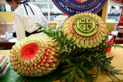 サイアム駅を利用した際、ホームからタイグルメフェスティバルの看板が見えたので行ってみました。会場は駅の目の前にあるサヤームセンターです。ここはいつ通っても何かしらイベントがやっていて、今回はたまたまグルメフェスティバルでした。フルーツカービングや屋台料理など様々なお店が並び、見ているだけで楽しめました。