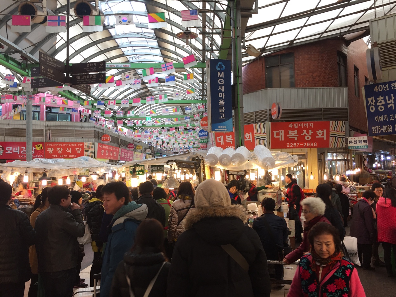 いつもすごい人です。揚げたてチヂミやマンドゥ、スンデなどの屋台がひしめきあっています。昼間からマッコリ片手にのんじゃうのも楽しい。