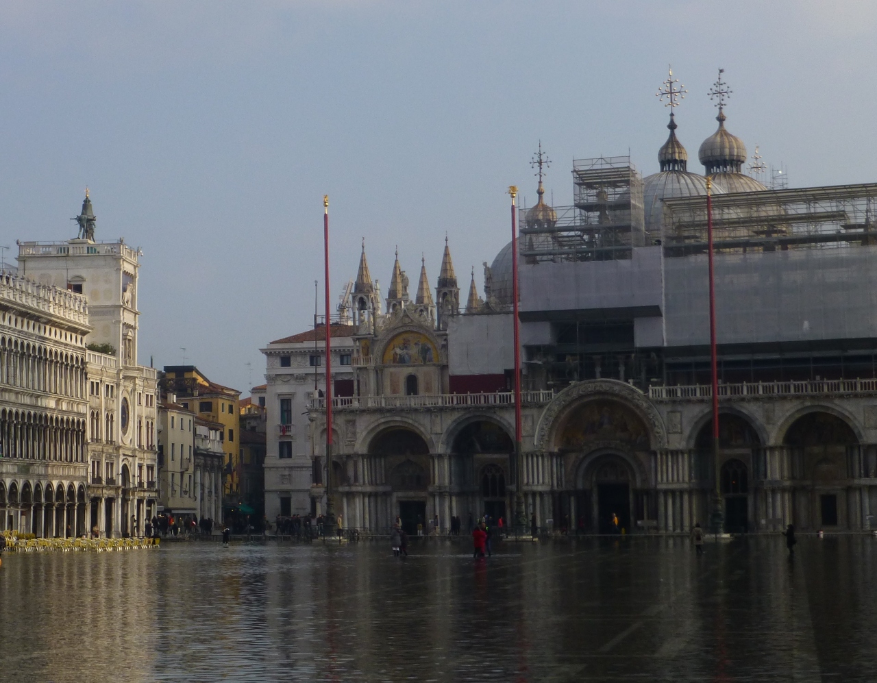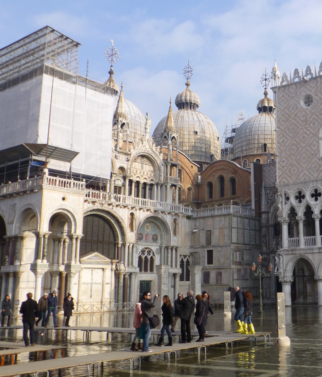 ベネチア一等地`サンマルコ広場`ですが、名付け親の[サンマルコ寺院]です。彫刻で豪華に飾り付けられた正面壁/尖がりとモスク状屋根/そして目に付くのはカーブのついた半円蓋=アーチの出入り門が並んでいることです…`新旧政庁/時計塔`のアーチ門も並列!;ビザンティン建築の特徴(?-?)。建屋の一部が工事中でした(^-T)