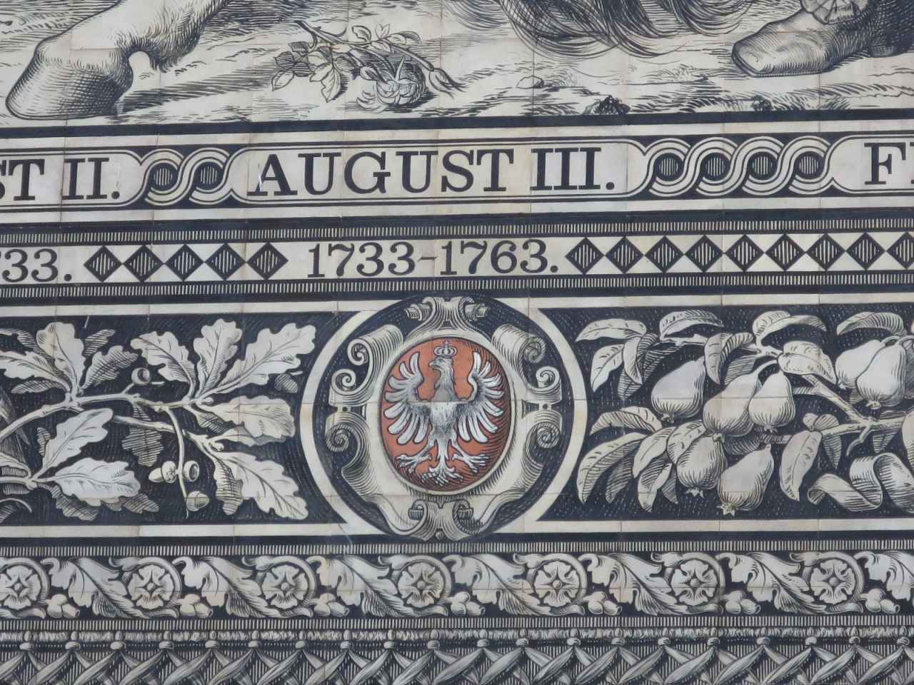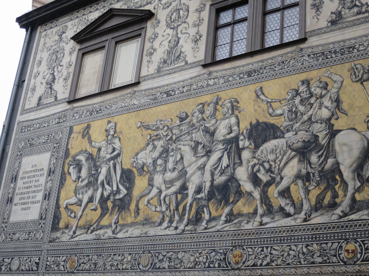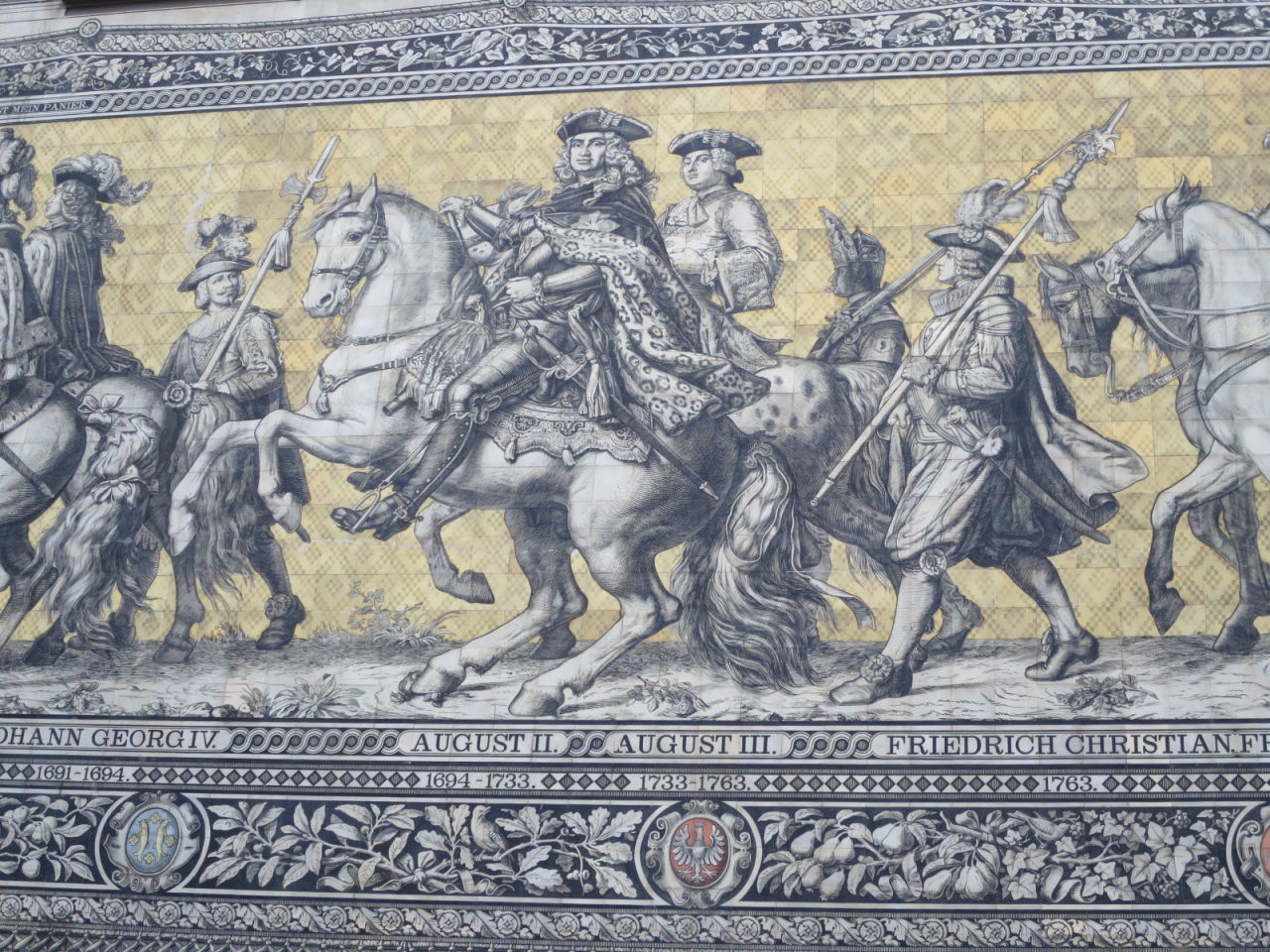 16世紀に宮殿の厩として建てられたシュタールホーフが、18世紀になって美しいアーチの歩廊に建てかえられました。その外壁にマイセン焼きのタイルで描かれた歴代君主の馬上行進「君主の行進」があります。長さは102mあり総勢93人。中央にアウグスト強王がいて、その後ろに息子のアウグスト3世がいます。赤を使用した部分は少ないようですが、傍で見ると細かいタッチがわかります。各君主の紋章を比べるのも面白いですよ、ひとつとして同じものはありません。