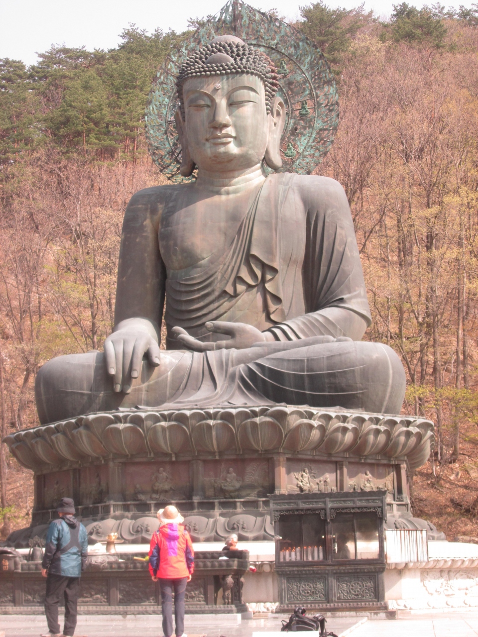 束草市街から雪岳山エリアまで路線バス利用で行き終点下車、すぐ雪岳山小公園内入って奥に山門をくぐると新興寺があります、ここで目立つのが大きな仏像です、境内には飲食何処や売店があります、又、散策路があり周辺山々を眺めながら歩くことができます