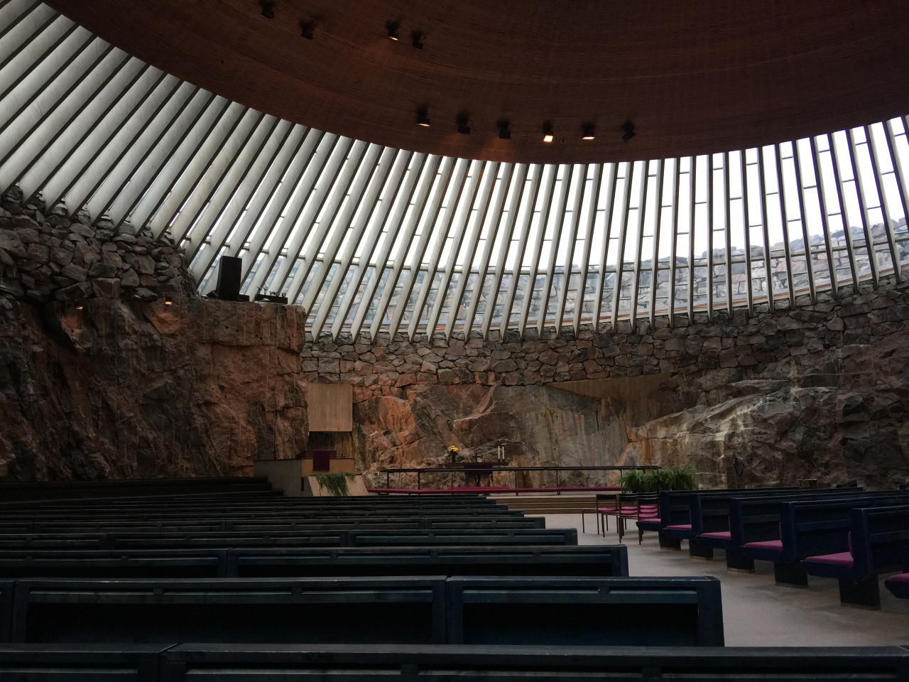 岩肌をくりぬいて作られている教会です。傾斜した屋根の部分はガラスがはめ込まれており、差し込む光で神秘的な雰囲気が漂います。地図で見ると中央駅などの中心部から離れているように見えますが、ヘルシンキの街は街区も小さく、徒歩で十分行けます。10~15分程度です。