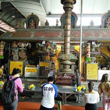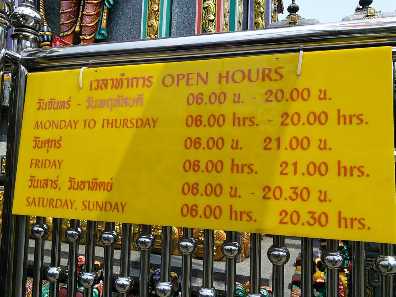 シーロム通りの中程にあるヒンドゥー寺院。極彩色の塔門が異彩を放っています。寺院に近付くとお香の香りが漂ってきます。内部は土足厳禁。バナナやココナッツ、飾り花、水などが盆に乗った“お供えセット”が60Bで売られています。参拝客が絶えずいますので作法がわからない方は真似するといいと思います。毎日お参りできますが時間が微妙に異なりますので写真を参照して下さい。
