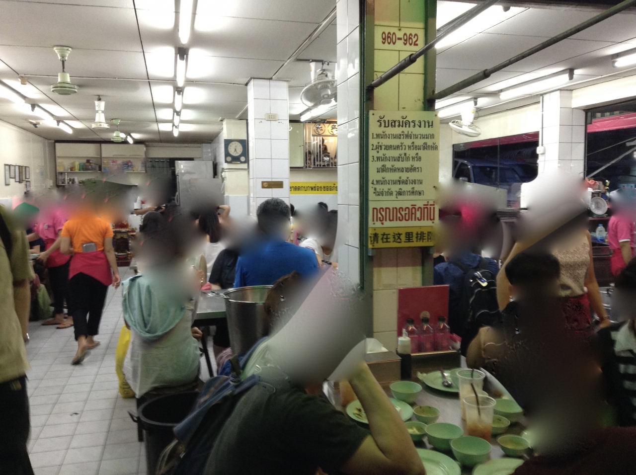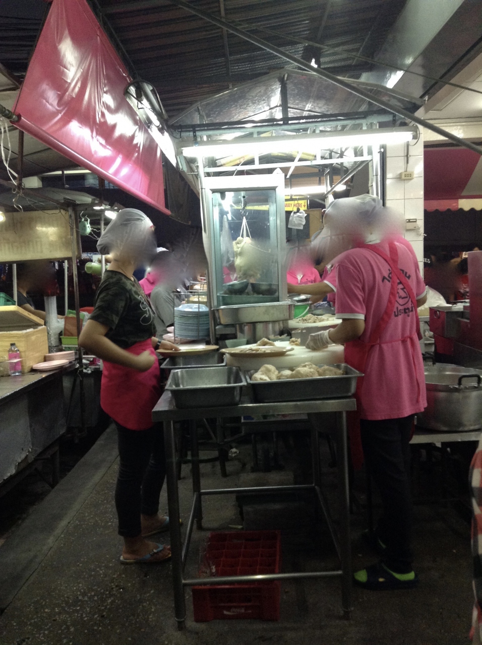 チットロム駅からビッグC方向側に15分ほど歩いて、右折するとお店がある現れます。看板はピンク、店員さんもピンクのTシャツを着ているので、すぐわかります。土曜日夜19時に訪れて、着席するまでに10分くらい待ったでしょうか。回転が早いので、列が長くてもすぐに回って来ます。お持ち帰りの列が別にあるので、そこに並ばないように要注意。