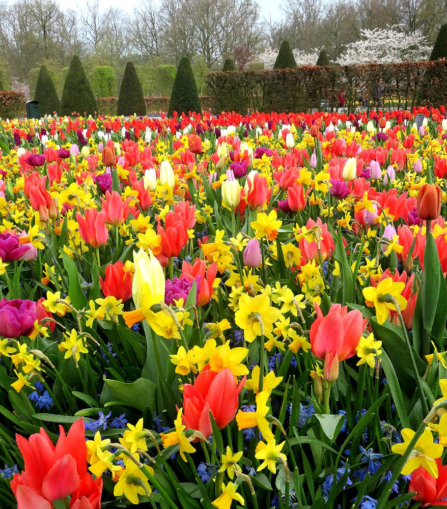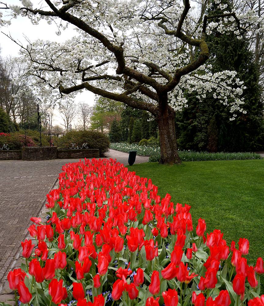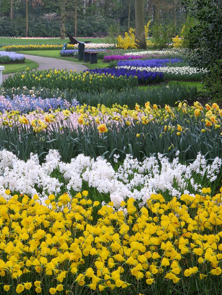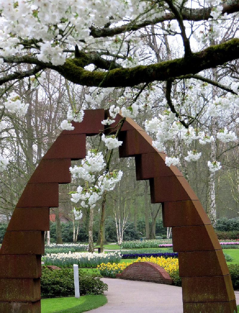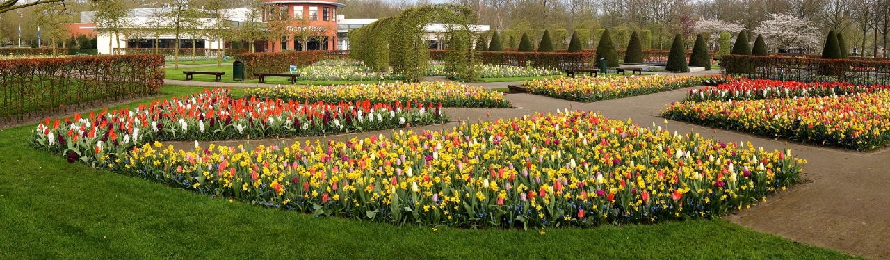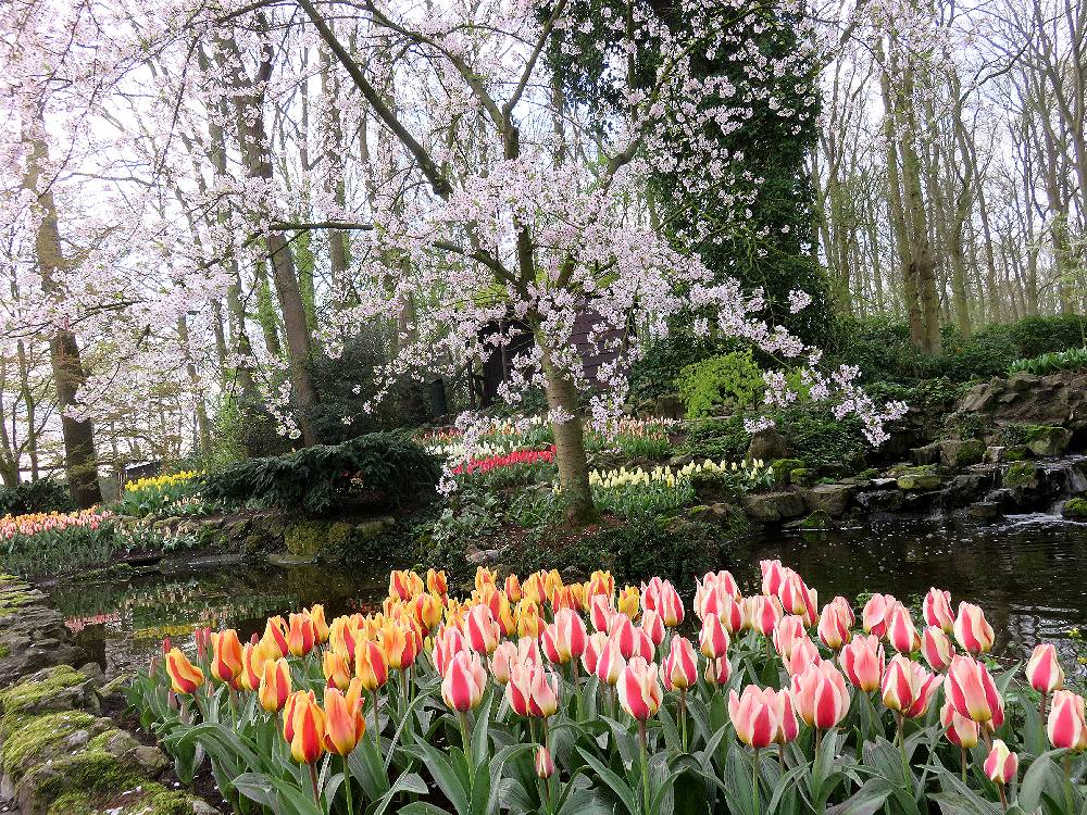 2016年4月14日に、アムステルダムでの20時間のトランジット時間を最大限に利用して訪れました。飛行機の出発が午後2時40分なので、午前中に見学を済ませるため、前日に公園に歩いて15分のホテルに宿泊しました。当日は朝8時の開門と同時に入場。そのためにほとんど人が入らない写真を撮影することができました。この時期、水仙とヒアヒンスが満開で、チューリップの見ごろにはあと数日というところでしょうか。また、思いがけず満開の美しい桜の花も見ることができました。2度目の訪問ですが、前回よりも、植え付けのデザインなどに工夫があり、年ごとに変えて飽きないようにしているのだろうと感じました。開門一時間後にはどっと人が増えるので、8時から9時までの入場をお勧めします。なおアムステルダムの空港からは858番のバスで往復すれば割引料金が利用できます。私達が空港から乗った361番のバスも公園の近くにとまりますが、公園まで15分ほど歩かなければなりません。このバスで来れば公園外の広大なチューリップ畑の横を歩いて行くことになります。ただし、割引はありません。なお、開園直後を過ぎると、チケット購入の窓口が長駄の列になるので、個人で来る人は、あらかじめネットで事前購入しておくことをお勧めします。