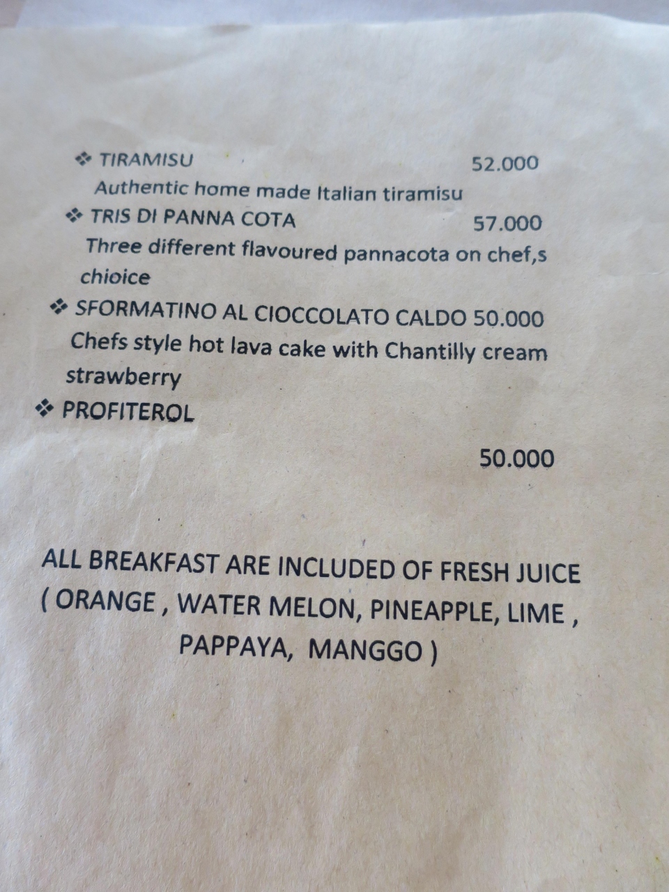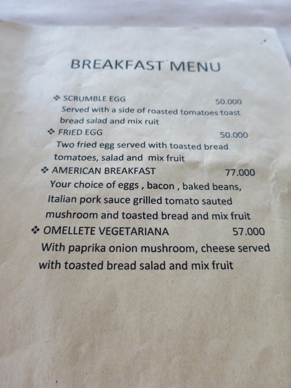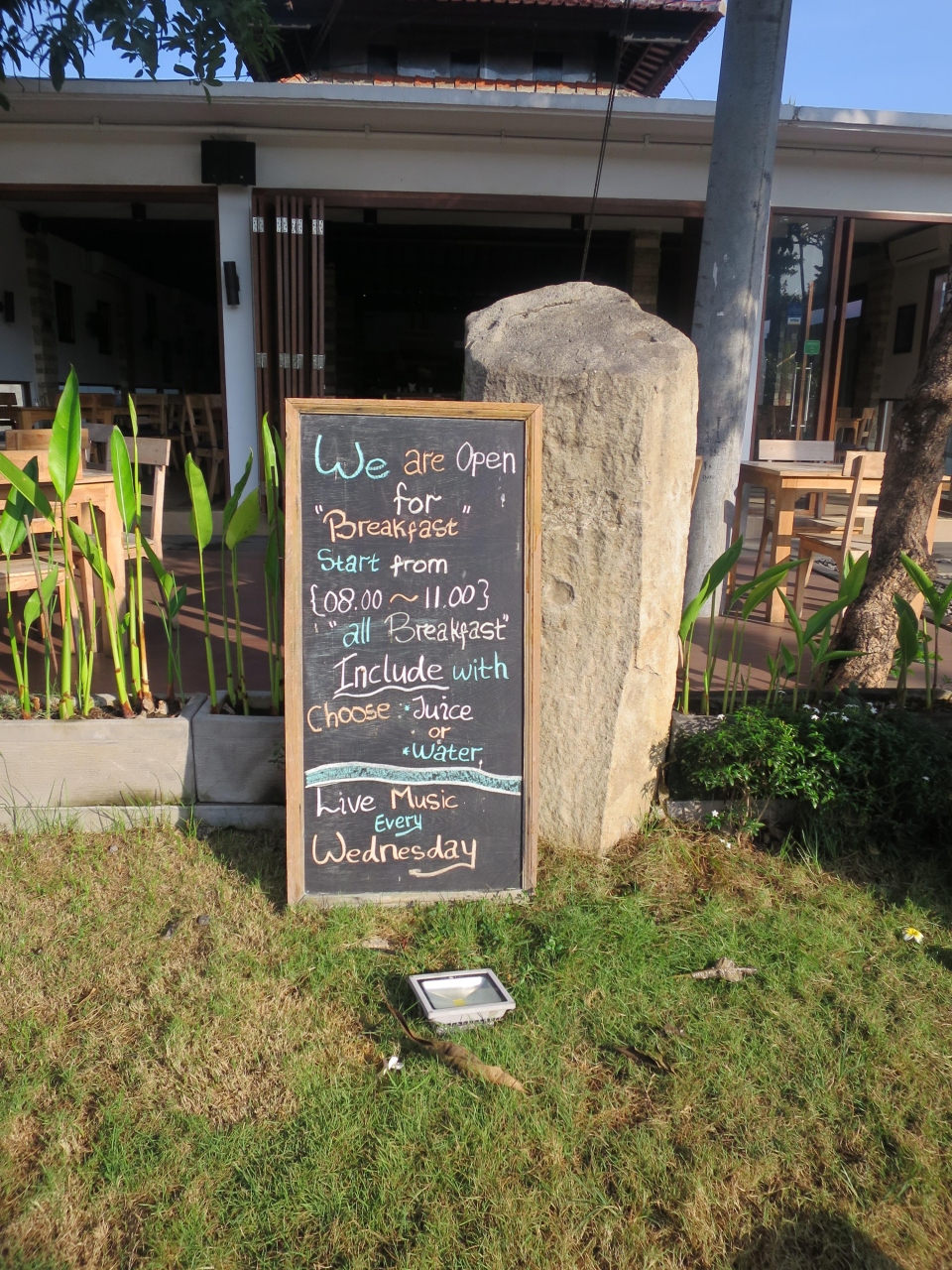 サヌールにあるイタリアン、TRATTRIAはbreakfastを8時からやっています。インドネシアンはありませんが、パンケーキ、サンドイッチ、卵料理などメニューは多く、驚くほど美味しい!パンケーキで35,000ルピアです。ジュースも込みです。