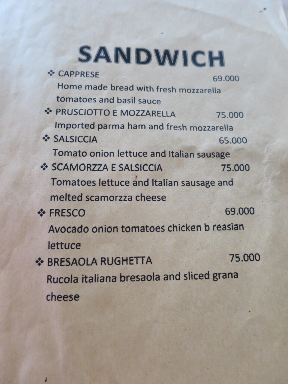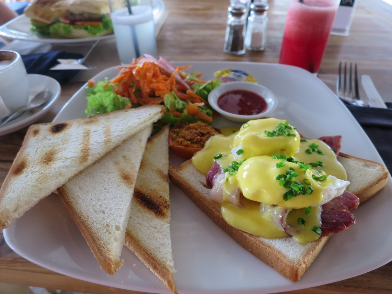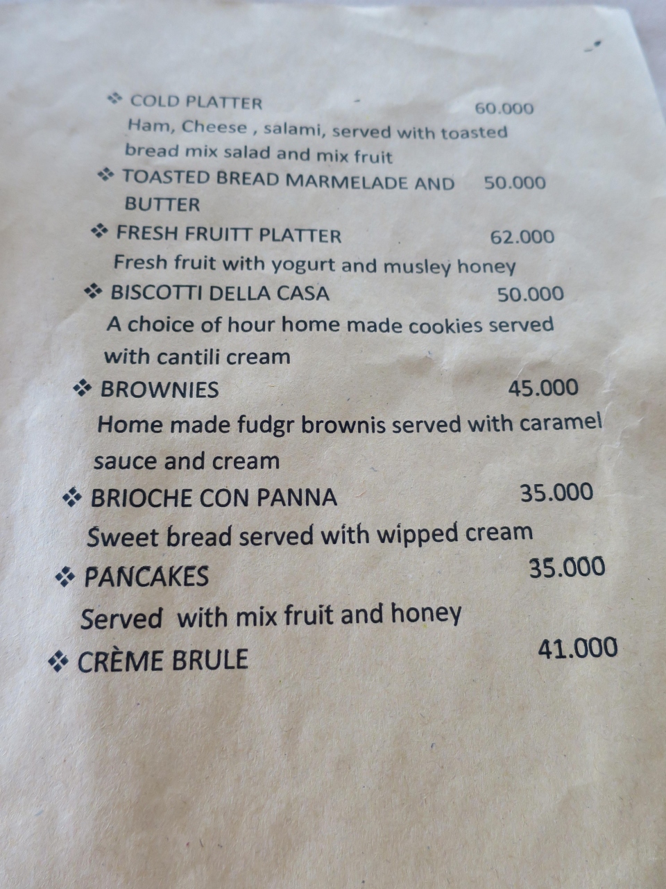 サヌールにあるイタリアン、TRATTRIAはbreakfastを8時からやっています。インドネシアンはありませんが、パンケーキ、サンドイッチ、卵料理などメニューは多く、驚くほど美味しい!パンケーキで35,000ルピアです。ジュースも込みです。