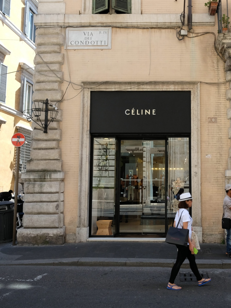 ローマ随一の高級ブランド街のコンドッティ通りの一画にあります。コンドッティ通りはスペイン広場から続く通りで、多くのブランドショップが連なっているので人通りも多く賑わっています。これだけブランド店が密に連なっていると買い物しやすいですね。