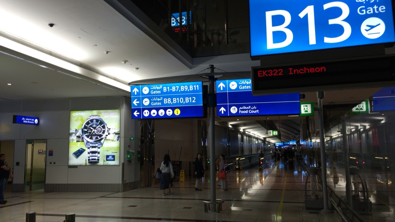 場所はドバイ空港ターミナル3のB13ゲート付近(韓国・仁川行の便が出ることが多いゲート、その先に成田行の便に当てられる事が多い11ゲートがあります。)