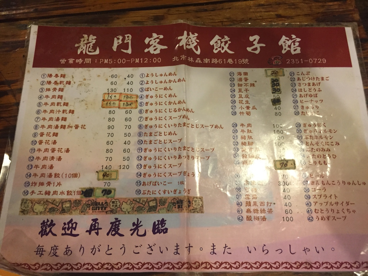 豚肉の水餃子11個入りと麺(牛肉卵とじスープ麺)を注文。日本語メニューもあり。