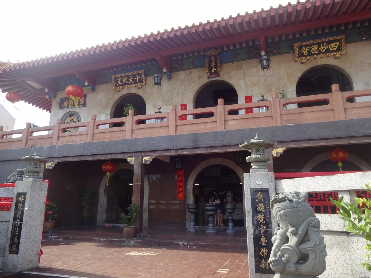 赤い瓦の建物と、カラフルな提灯、明るい雰囲気の寺院でした。