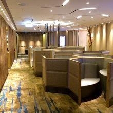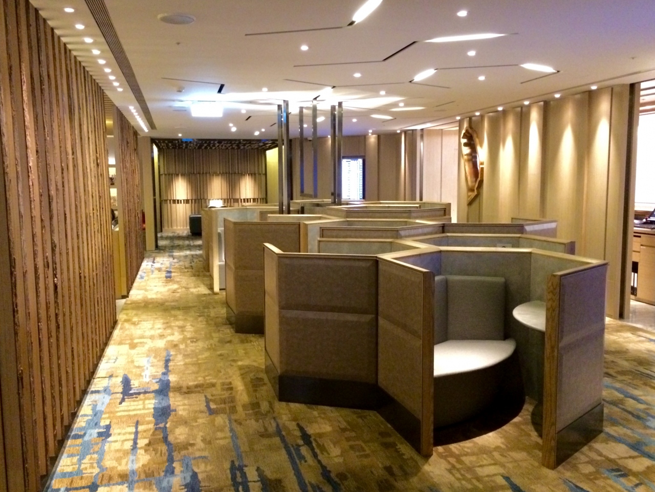 出国審査直後にあり、ゲートまでは少し歩く。CXやTG、GEも同じ並びにあるので、ここだけが悪いわけではないが。食事はオーダー制で、充実している。ビジネスクラスの座席のような、プライベートを保てるタイプの椅子もある。