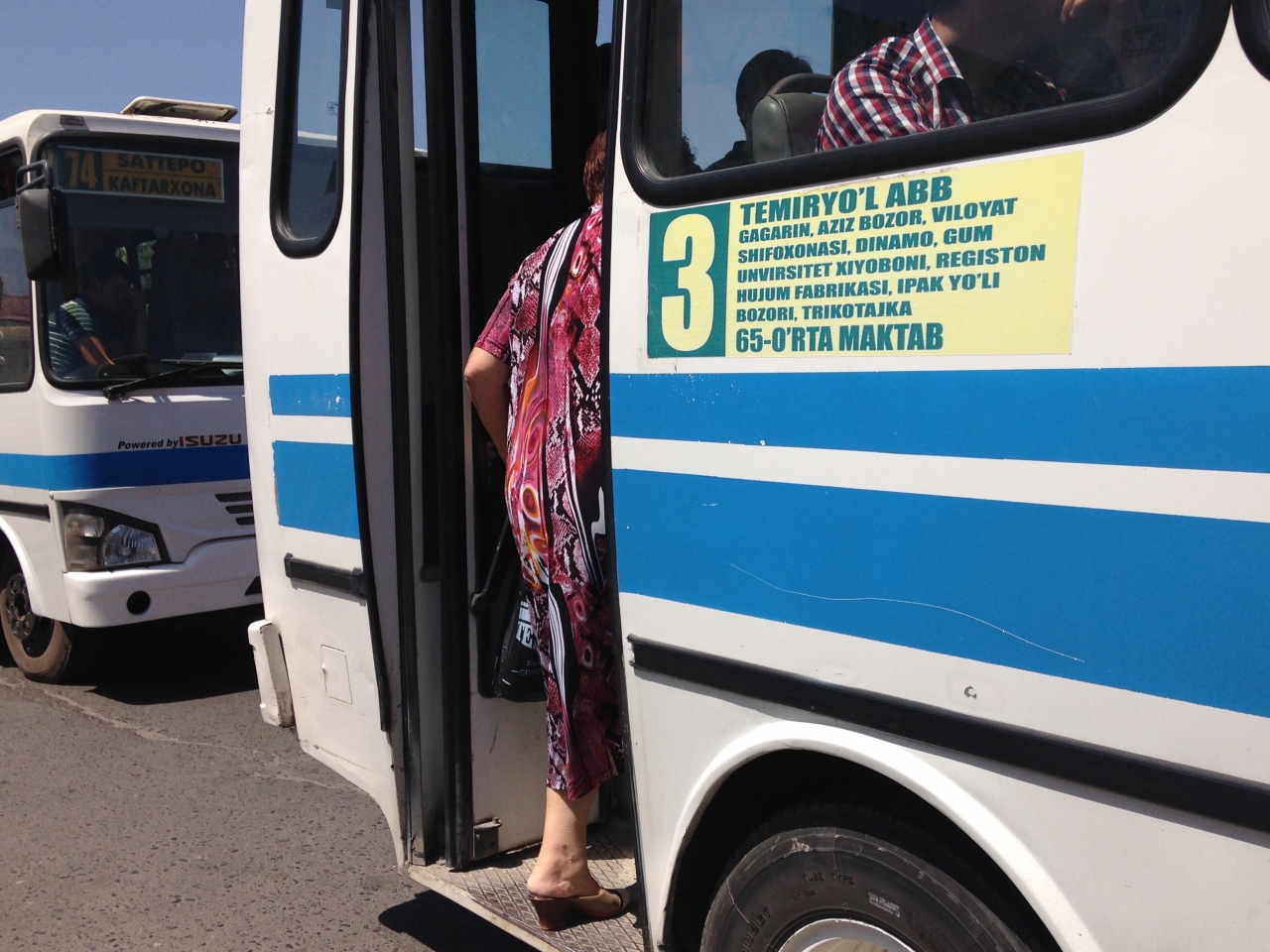 サマルカンドは観光の中心である旧市街地と、その外側の広大な新市街地があります。主に新市街地に行くときに役に立つ交通機関が路線バス/乗り合いバスです。料金は市内一律700スム(約0.15ドル)と庶民に優しい値段設定。