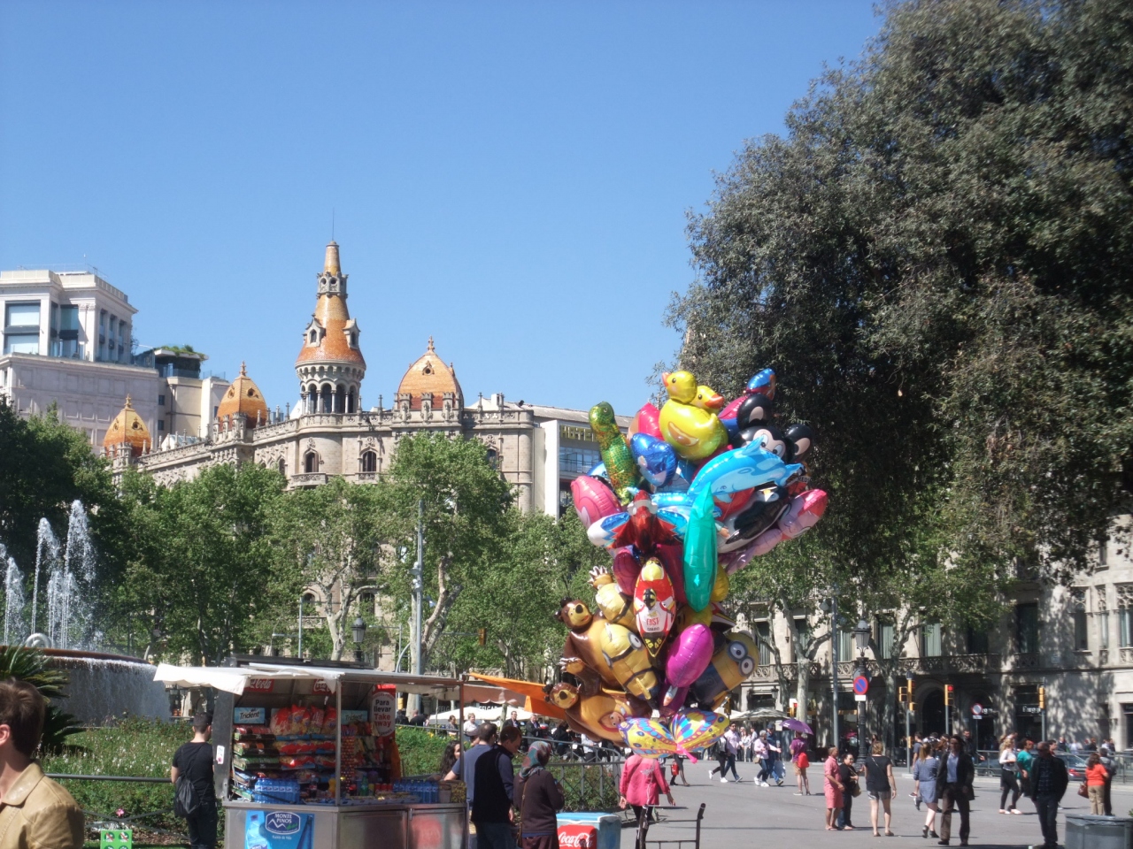 南はランブラス通り、北はグラシア通り、東にはデパート、エルコルテと空港からのバスAeroBusや市内バスの発着所。バルセロナ観光の起点です。