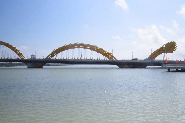 ロン橋(ドラゴンブリッジ)は、2013年3月末に開通し、ソンハン橋に次ぐダナンのシンボルとなっています。全長666mのこの橋は「世界最長の鋼鉄製ドラゴン」としてギネスブックに登録されています。この橋はダナン解放38周年を祝して作られたということもあり、祝日やイベントの際などに火を噴くパフォーマンスを行うそうです。道路は片側3車線と広いです。夜はライトアップされて美しいそうですが、今日中にホイアンに移動しなければならず、ライトアップは残念ながら見られませんでした。今度、ダナンを訪れる機会があったら、火を噴くパフォーマンスを見たいです。
