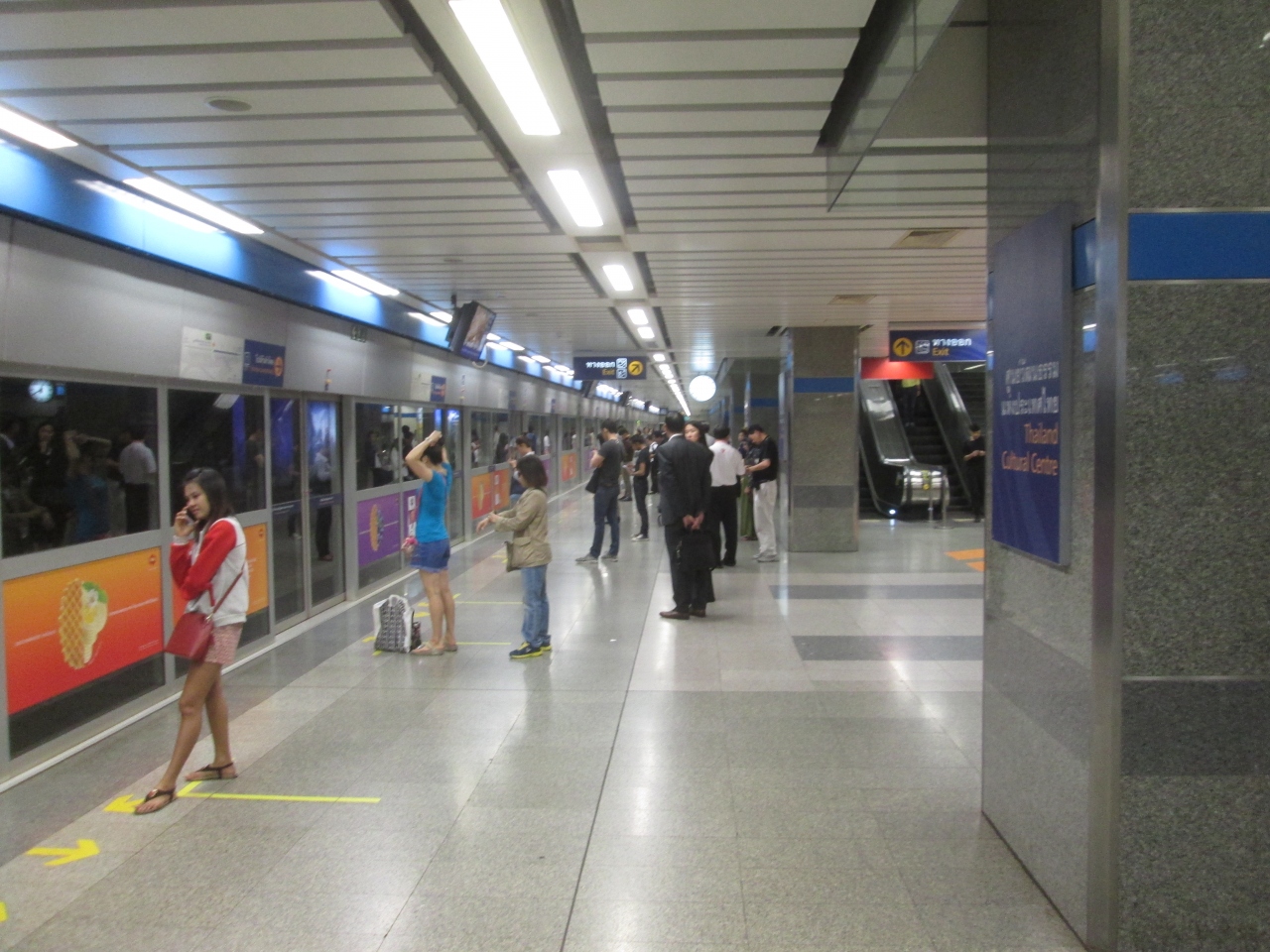 島式ホーム1面2線の地下駅です。駅ホームにはガラス製の安全柵が付いています。時刻表がないMRTですが、頭上にはテレビモニターがあり、駅に到着する電車の待ち時間が表示されています。また、そのモニターには映像での広告宣伝などが流れており、待ち時間に視聴できます。
