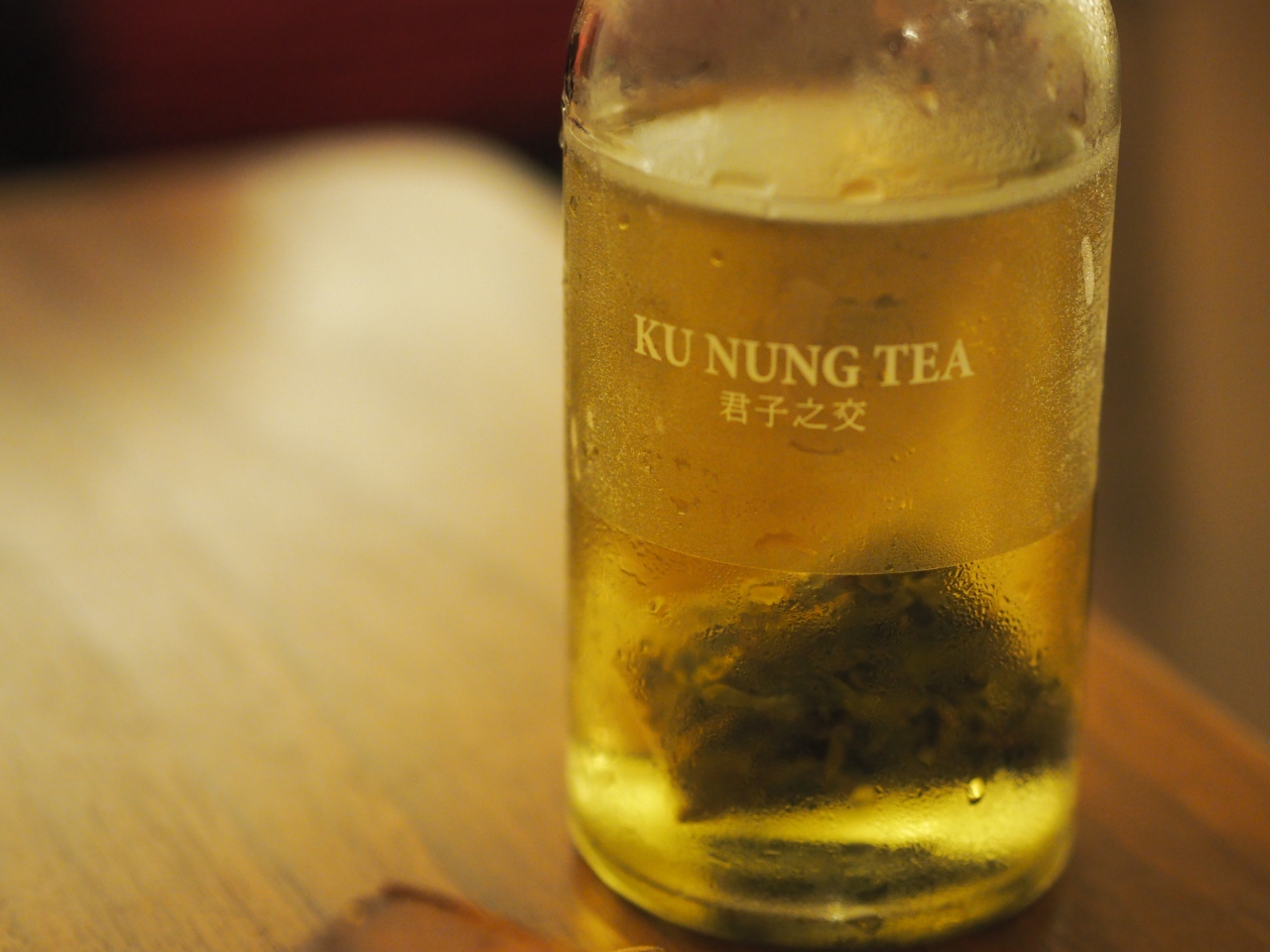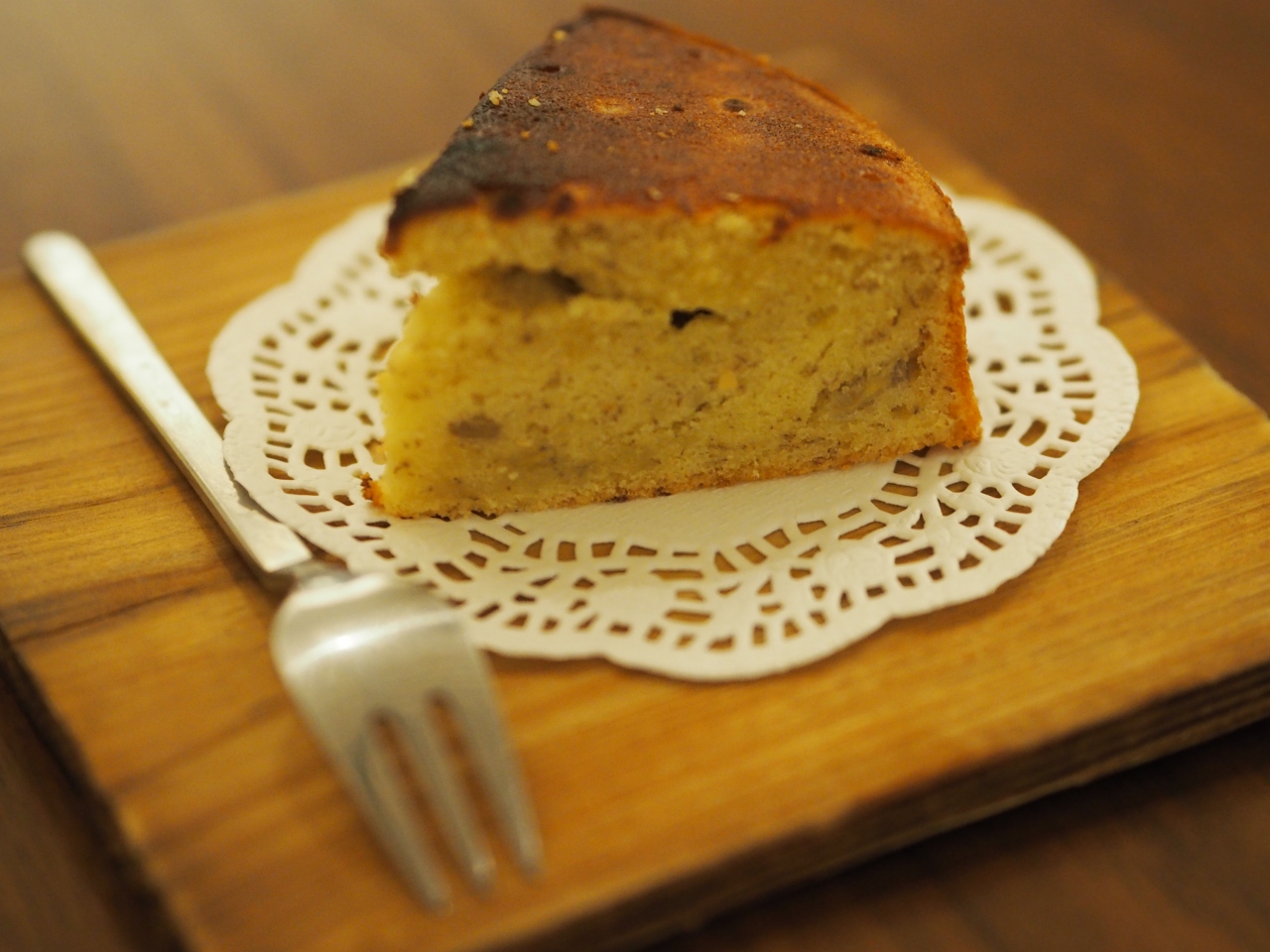 静かな雰囲気の中で冷たいお茶とバナナケーキをチョイス。