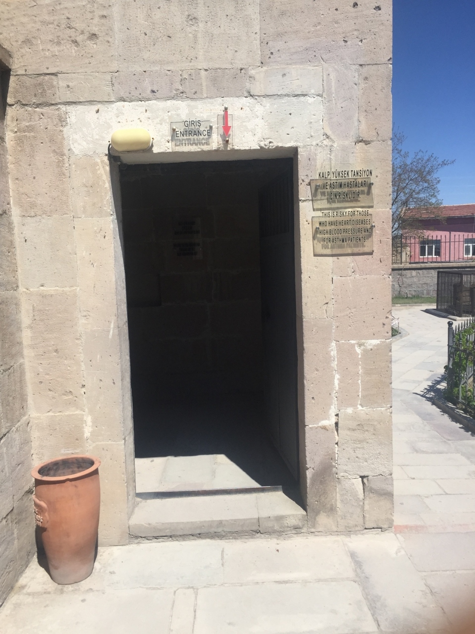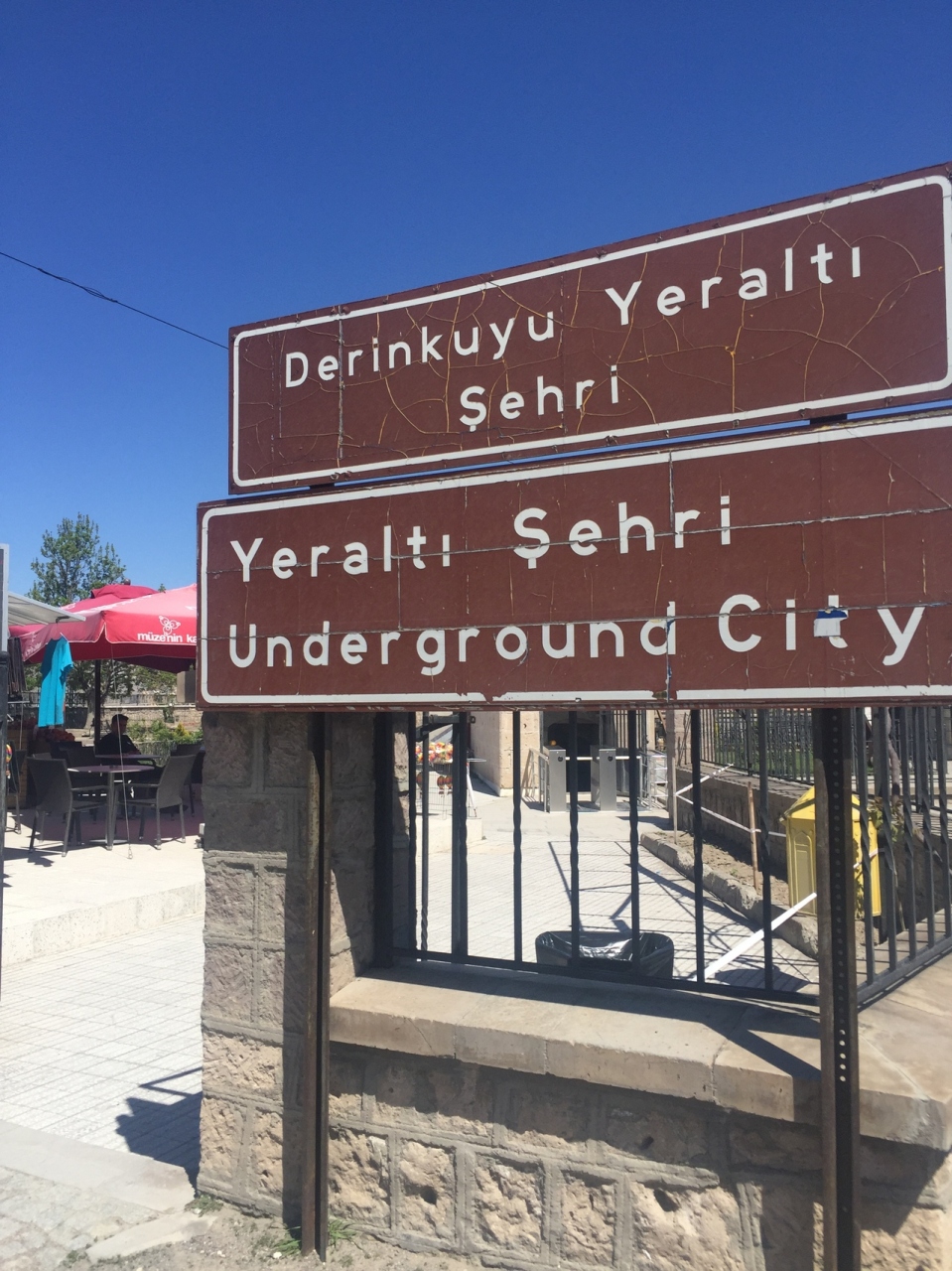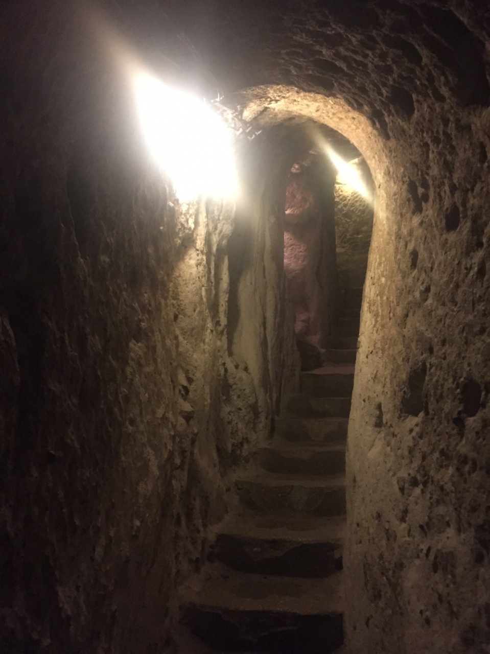 場所はこんな所にあるの?と言う所にあり全然観光地になってなくて小さいな街の広場に入り口があります。行き方は、ギョレメからネヴシェヒル行きのバスに乗り、ネヴシェヒルからデリンクユ方面のバスに乗り換えます。バスの運転手さんかもう一人乗務員が居るのでデリンクユに行くと言えば乗り換えの所で教えてくれてデリンクユでも地下都市の近くで教えてくれます。バスを降りれば看板があるので、その方に歩いて行けば着きます。入場料は25TLです。中に入ると冷んやりとしていて、薄暗く通路は屈まないと歩けません。頭上には気おつけて下さい。
