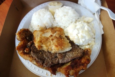 マヒマヒ、ステーキ、チキンカツ、マカロニサラダ、ご飯2盛り。このボリュームで10ドルしません。ロコ価格です。