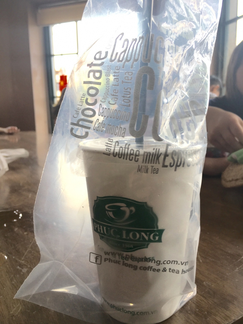 ベンタイン市場近くのバスターミナルから路線バスに乗る前に、アイスコーヒーをテイクアウトしました。ビニールバッグに入れてくれて安心です。