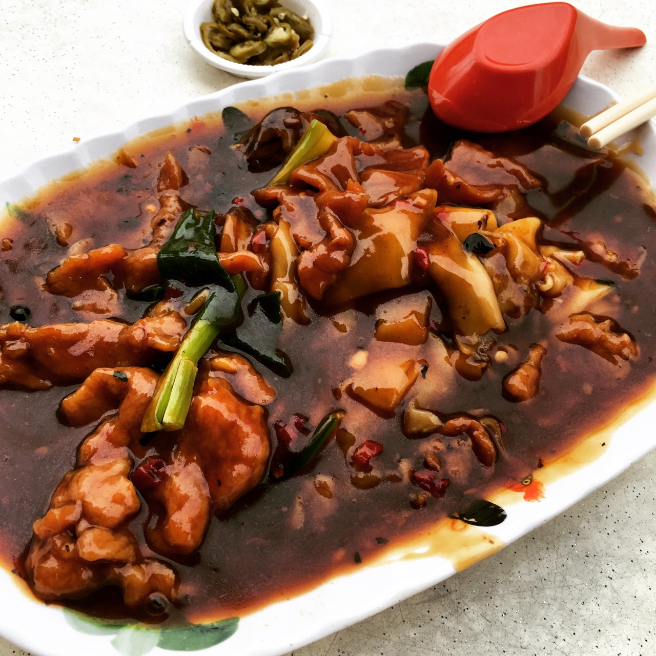 きしめんより大きめの米麺で、食感はもちもちしている。これに牛肉炒めとあんをかけたものだが、ややスパイシーな味付けで、食欲がそそられる。