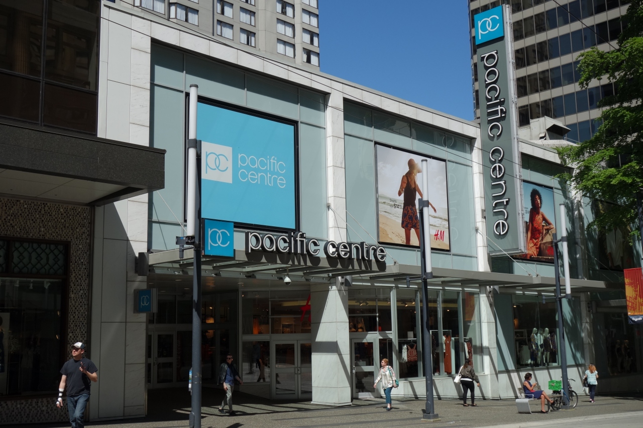 ダウンタウンの中心に位置し、スカイトレインの駅からすぐで、とても便利なショッピングセンターです。デパートや衣料品、雑貨、フードコートなどの店が集まっていて、平日でも結構にぎやかで週末はかなり混み合っています。