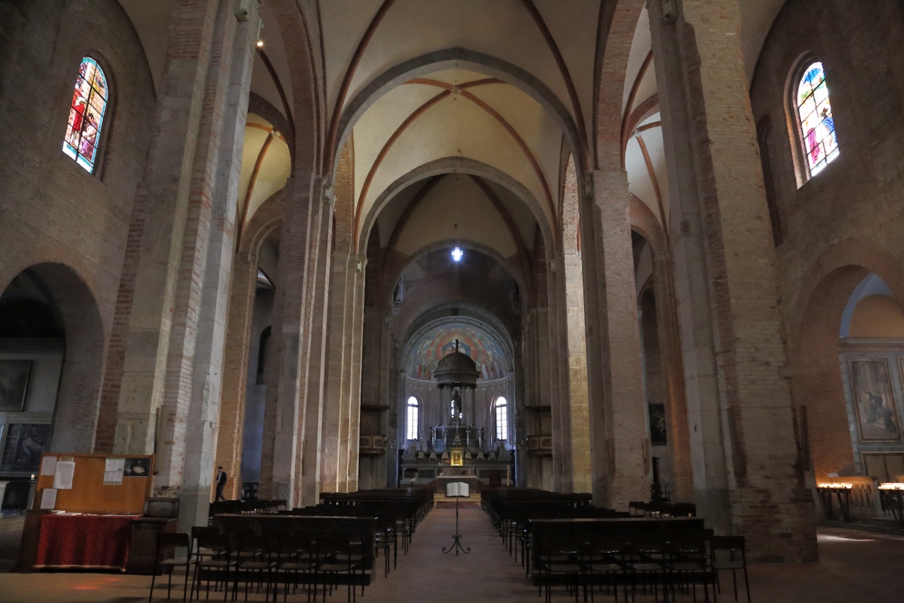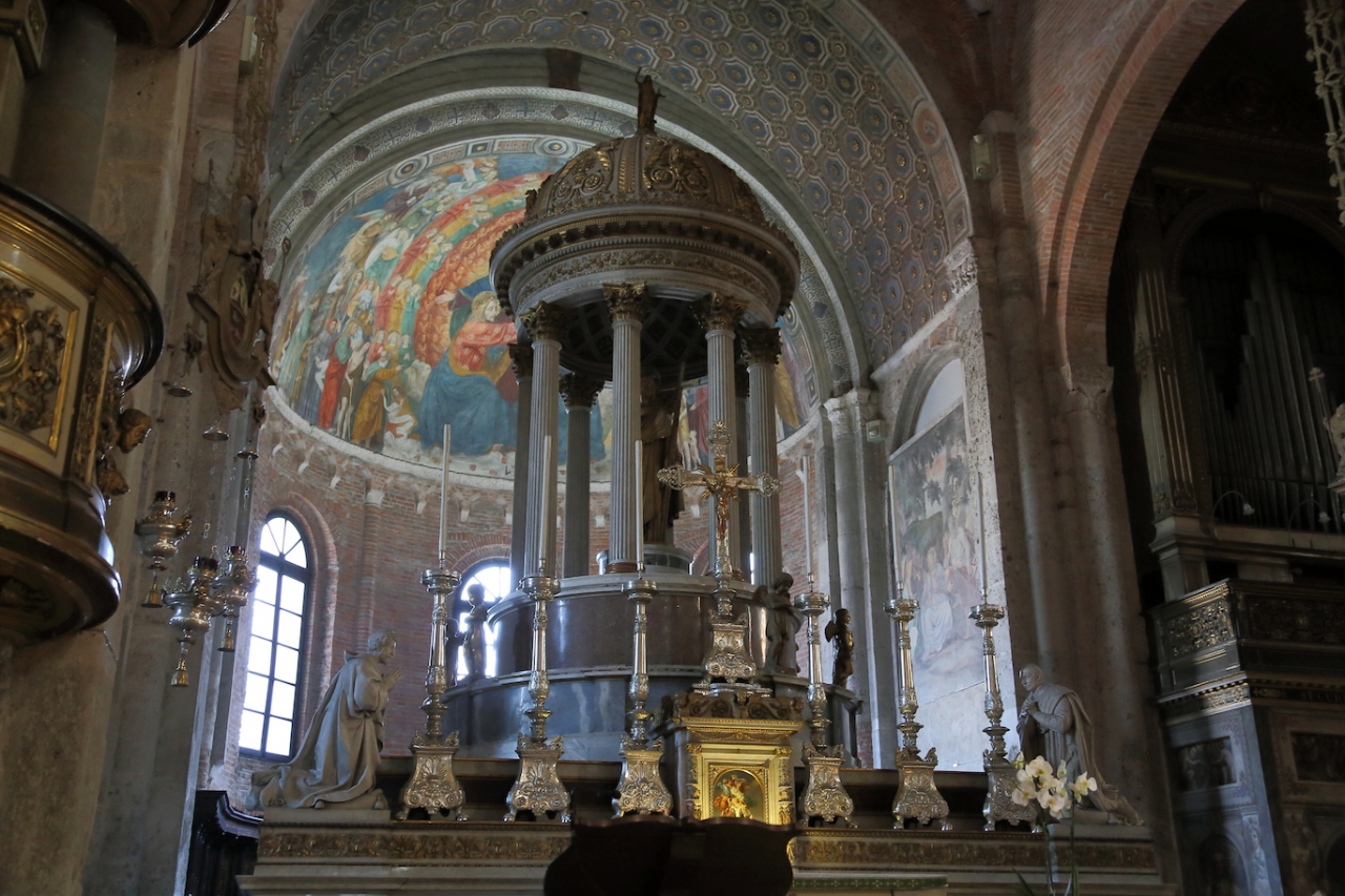 ミラノで2番目に古い教会ですが、その面影を残しているのはファサードだけのようです。教会堂自体は12~13世紀の間にロマネスク様式で立て替えられていて、付属している礼拝堂はルネサンス、バロック、ロココ、ネオクラシカルと、色々な様式で作られています。
